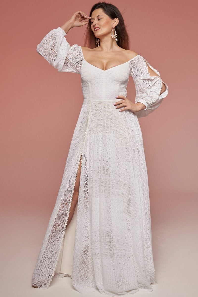Ta suknia to model wyjściowy - możemy w niej zmienić praktycznie wszystko! Pogłębić lub spłycić dekolt, zmienić jego wykończenie, kształt, dodać lub odjąć falbankę czy frędzle. Rękawy mogą być dłuższe lub krótsze, mieć inny kształt niż te na zdjęciu. Może też nie być ich wcale. Tiul w spódnicy można dodać (lub odjąć) na wierzchu, albo pod spodem. Podszewka może być długa lub krótka w odcieniach bieli i beżu. Rozcięcie na nogę i tren można dodać lub usunąć praktycznie w każdym modelu.