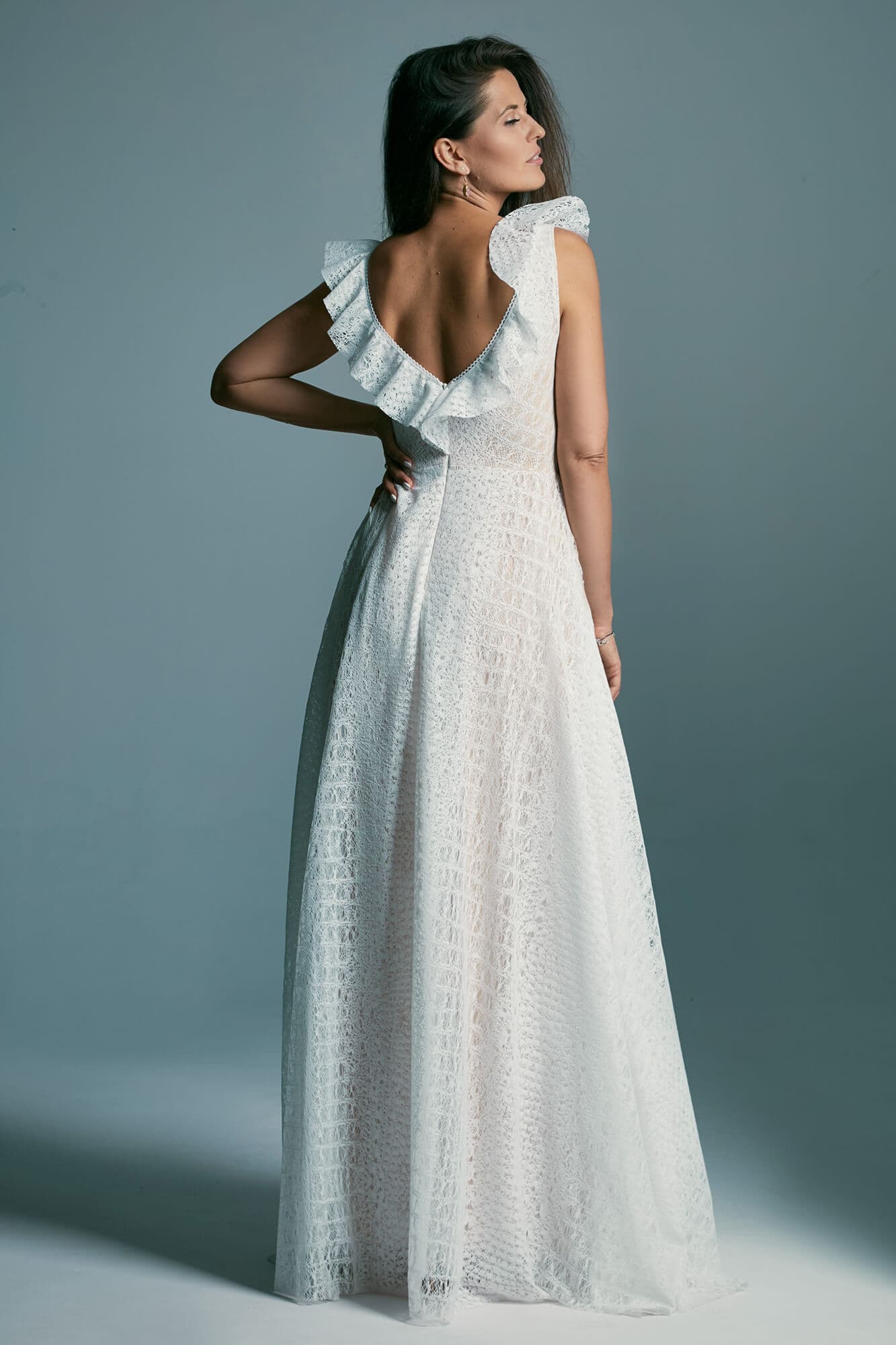 Ta suknia to model wyjściowy - możemy w niej zmienić praktycznie wszystko! Pogłębić lub spłycić dekolt, zmienić jego wykończenie, kształt, dodać lub odjąć falbankę czy frędzle. Rękawy mogą być dłuższe lub krótsze, mieć inny kształt niż te na zdjęciu. Może też nie być ich wcale. Tiul w spódnicy można dodać (lub odjąć) na wierzchu, albo pod spodem. Podszewka może być długa lub krótka w odcieniach bieli i beżu. Rozcięcie na nogę i tren można dodać lub usunąć praktycznie w każdym modelu.