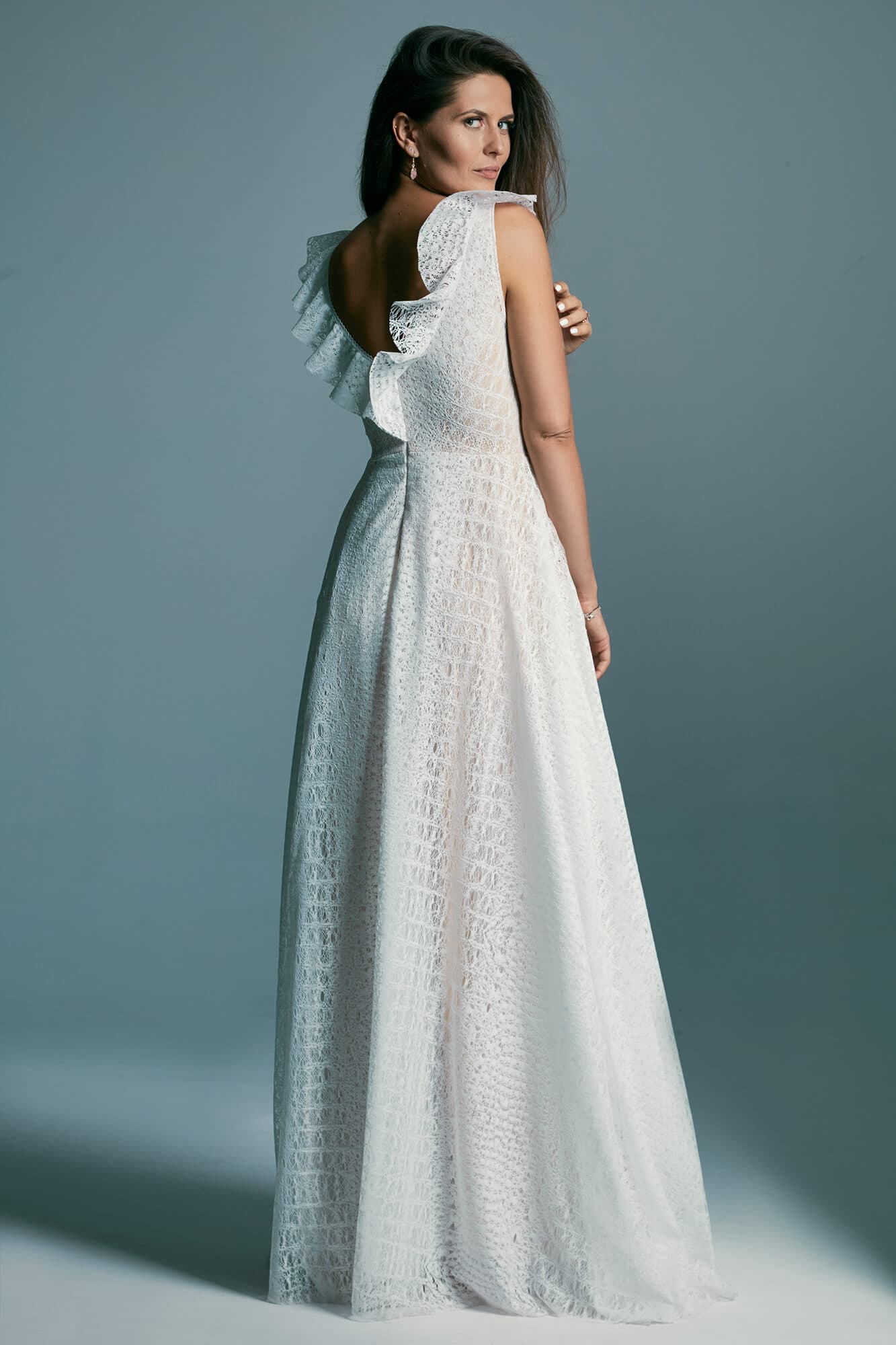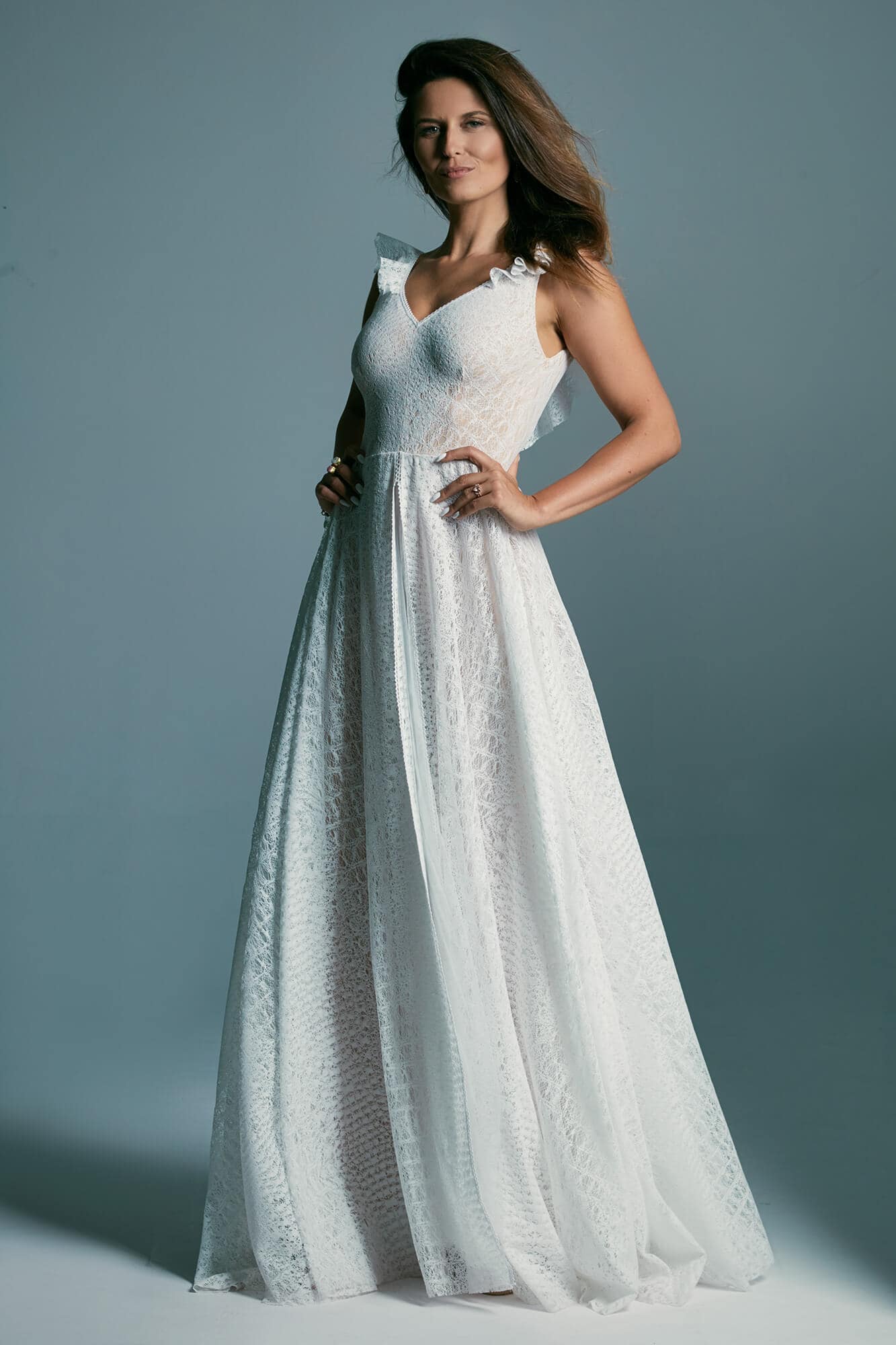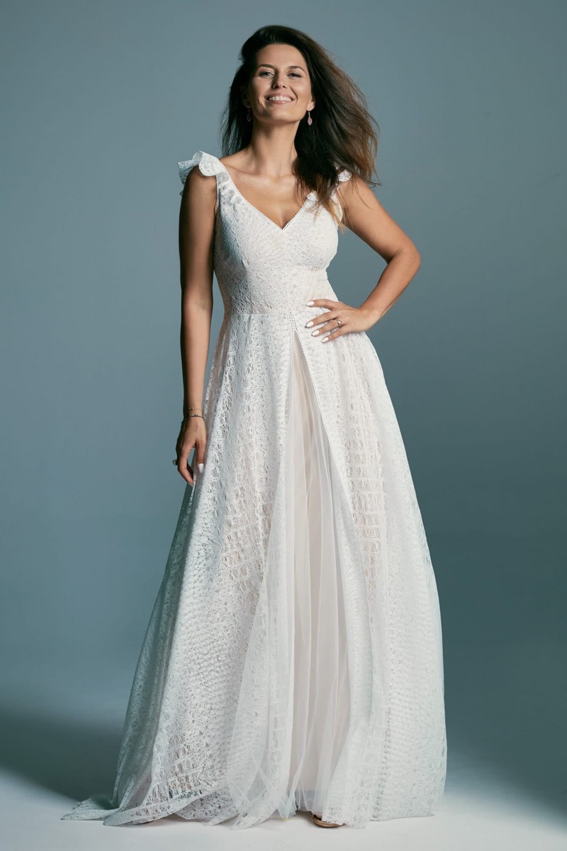 Uszyta ze sprawdzonych i przetestowanych przez nas materiałów. Używane przez nas koronki są mięciutkie, a dzięki swej lekkości cudownie układają się na sylwetce i pięknie wirują w tańcu. Ich elastyczność sprawia, że pracują z Twoim ciałem. Zapewniają komfort rosnącemu ciążowemu brzuszkowi. Praktycznie wszystkie nasze koronki są łatwe do prania w domowej pralce i niegniotące, dzięki czemu swoją suknię spokojnie możesz spakować do walizki i zabrać na romantyczną sesję poślubną.