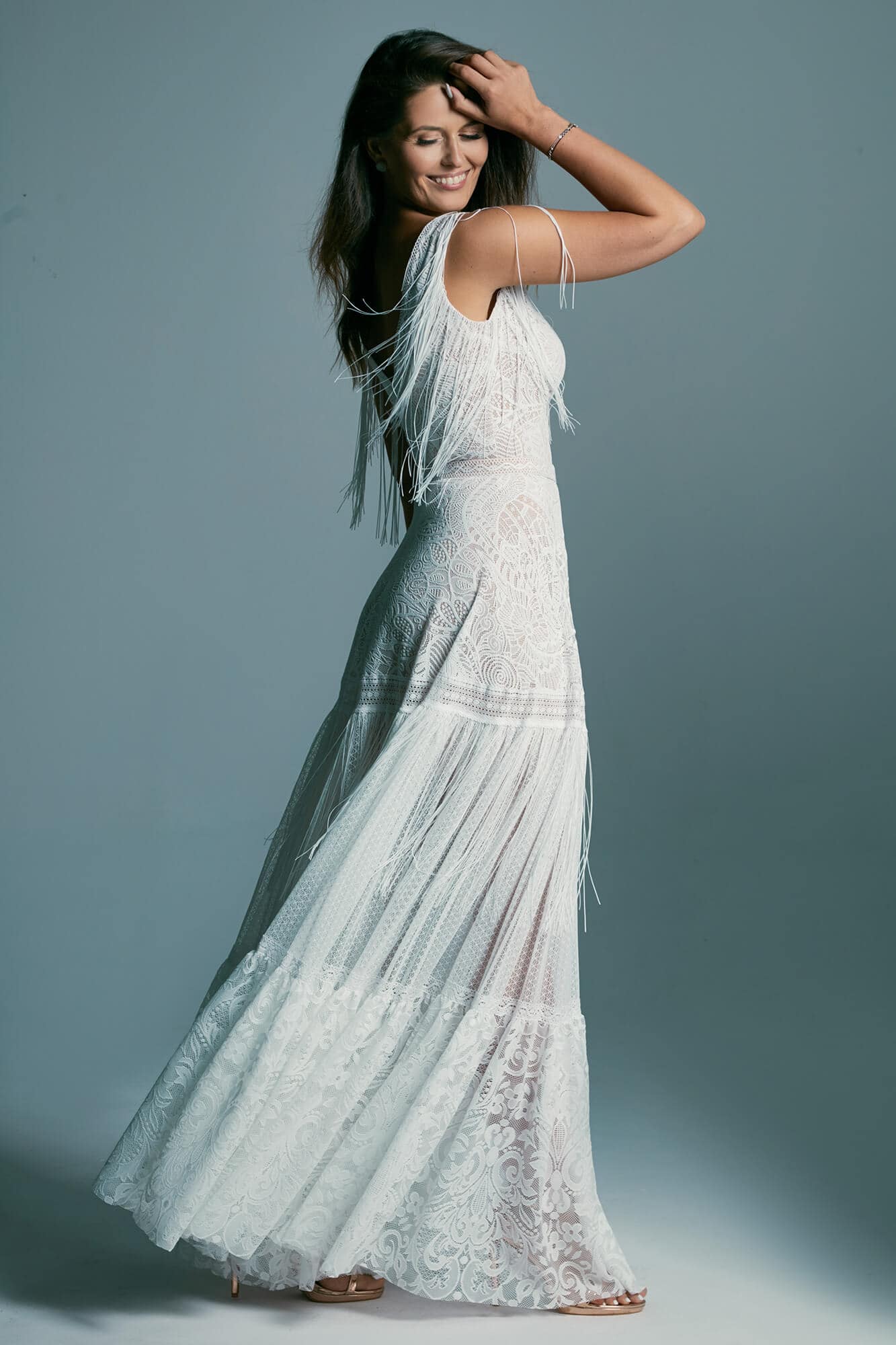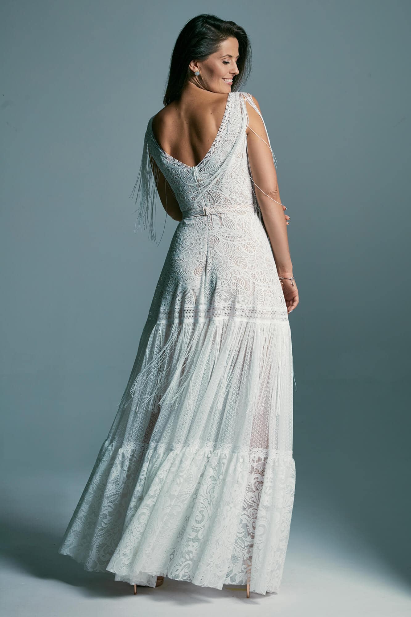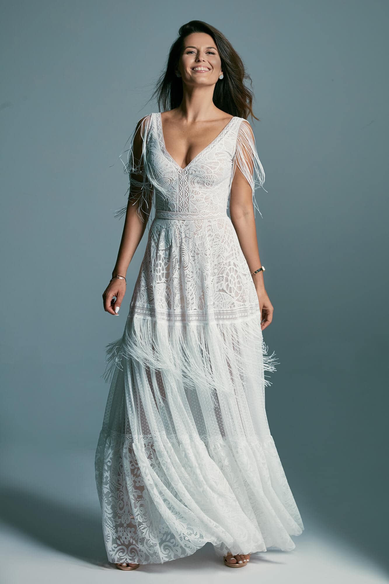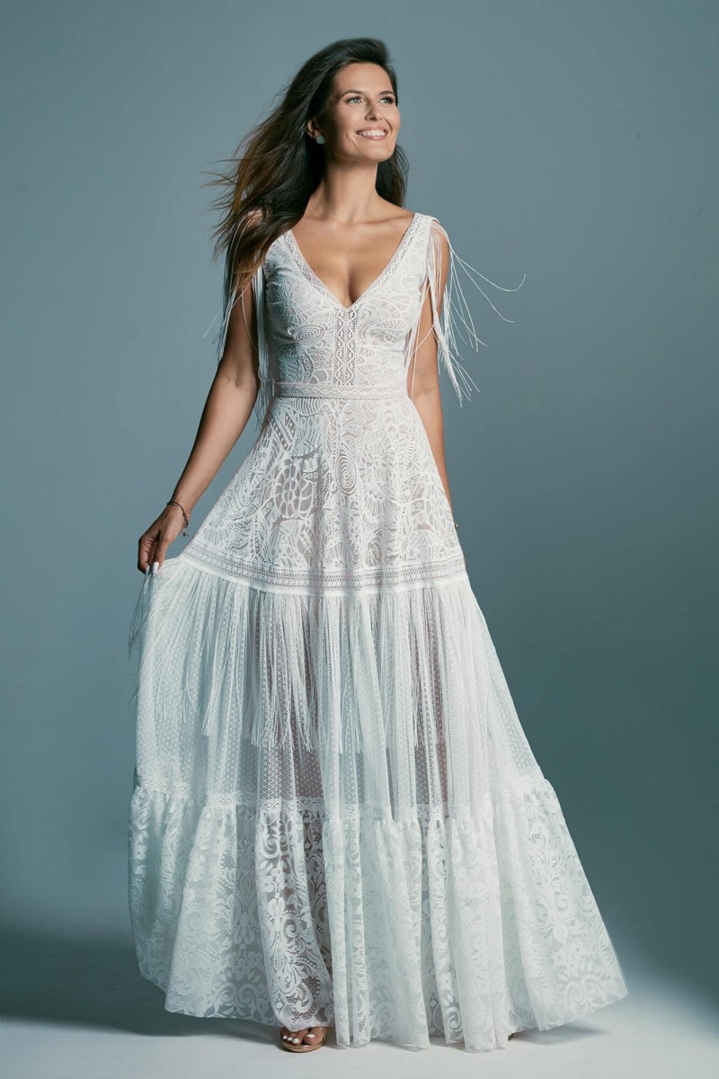 Ta suknia to model wyjściowy - możemy w niej zmienić praktycznie wszystko! Pogłębić lub spłycić dekolt, zmienić jego wykończenie, kształt, dodać lub odjąć falbankę czy frędzle. Rękawy mogą być dłuższe lub krótsze, mieć inny kształt niż te na zdjęciu. Może też nie być ich wcale. Tiul w spódnicy można dodać (lub odjąć) na wierzchu, albo pod spodem. Podszewka może być długa lub krótka w odcieniach bieli i beżu. Rozcięcie na nogę i tren można dodać lub usunąć praktycznie w każdym modelu.