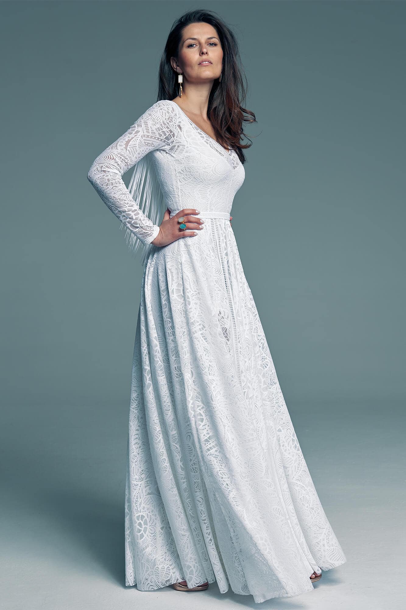 Ta suknia to model wyjściowy - możemy w niej zmienić praktycznie wszystko! Pogłębić lub spłycić dekolt, zmienić jego wykończenie, kształt, dodać lub odjąć falbankę czy frędzle. Rękawy mogą być dłuższe lub krótsze, mieć inny kształt niż te na zdjęciu. Może też nie być ich wcale. Tiul w spódnicy można dodać (lub odjąć) na wierzchu, albo pod spodem. Podszewka może być długa lub krótka w odcieniach bieli i beżu. Rozcięcie na nogę i tren można dodać lub usunąć praktycznie w każdym modelu.