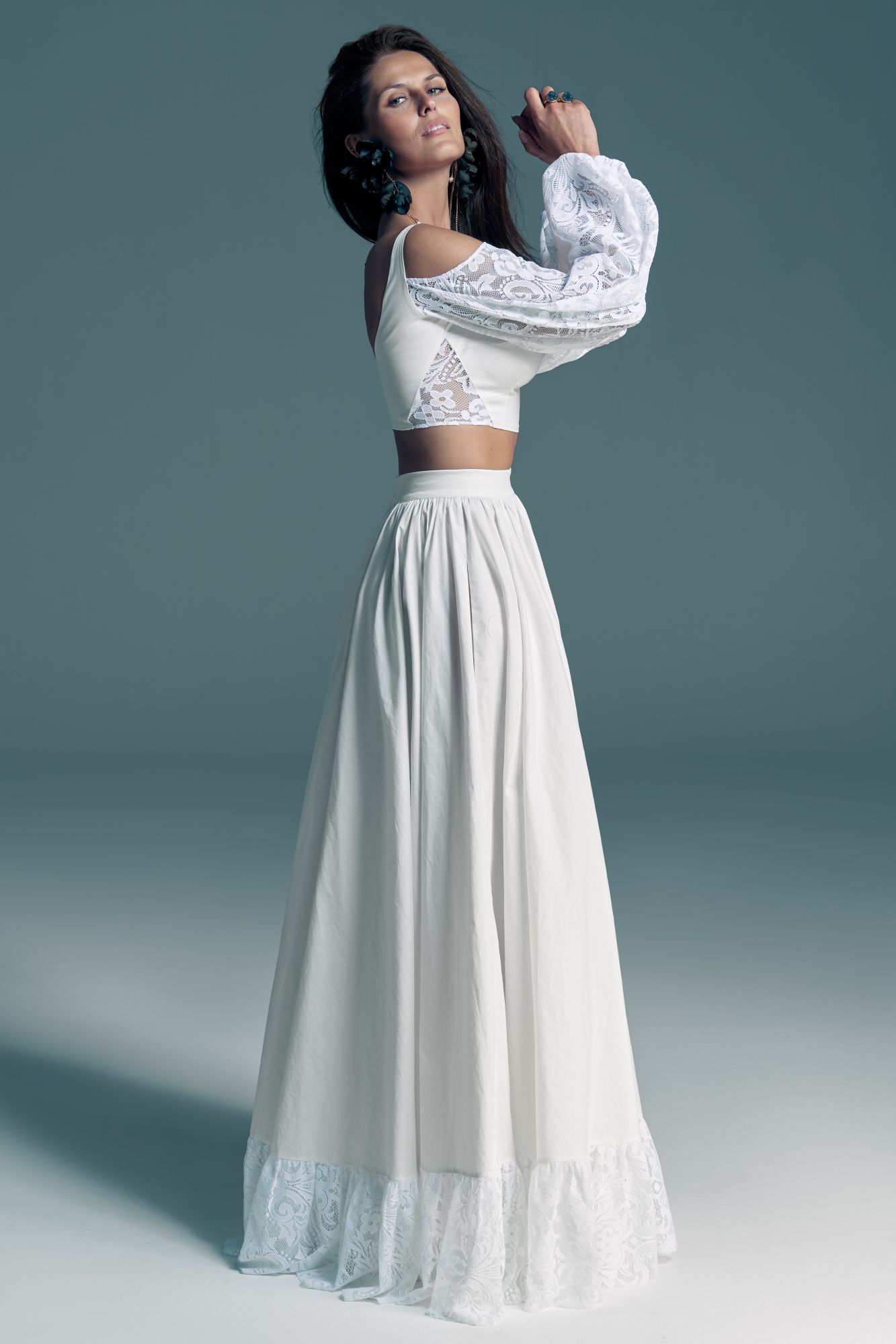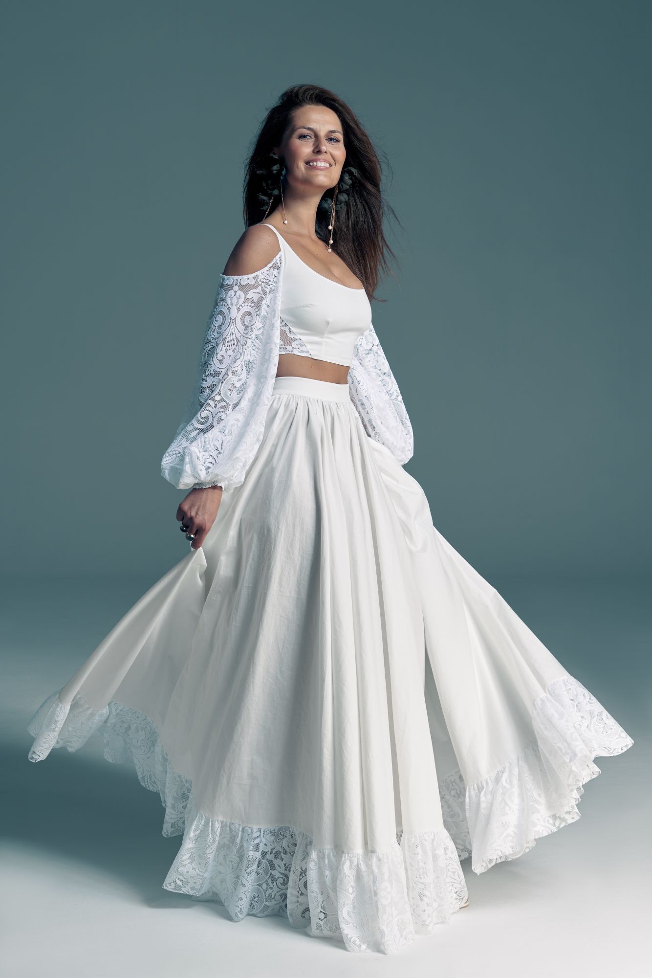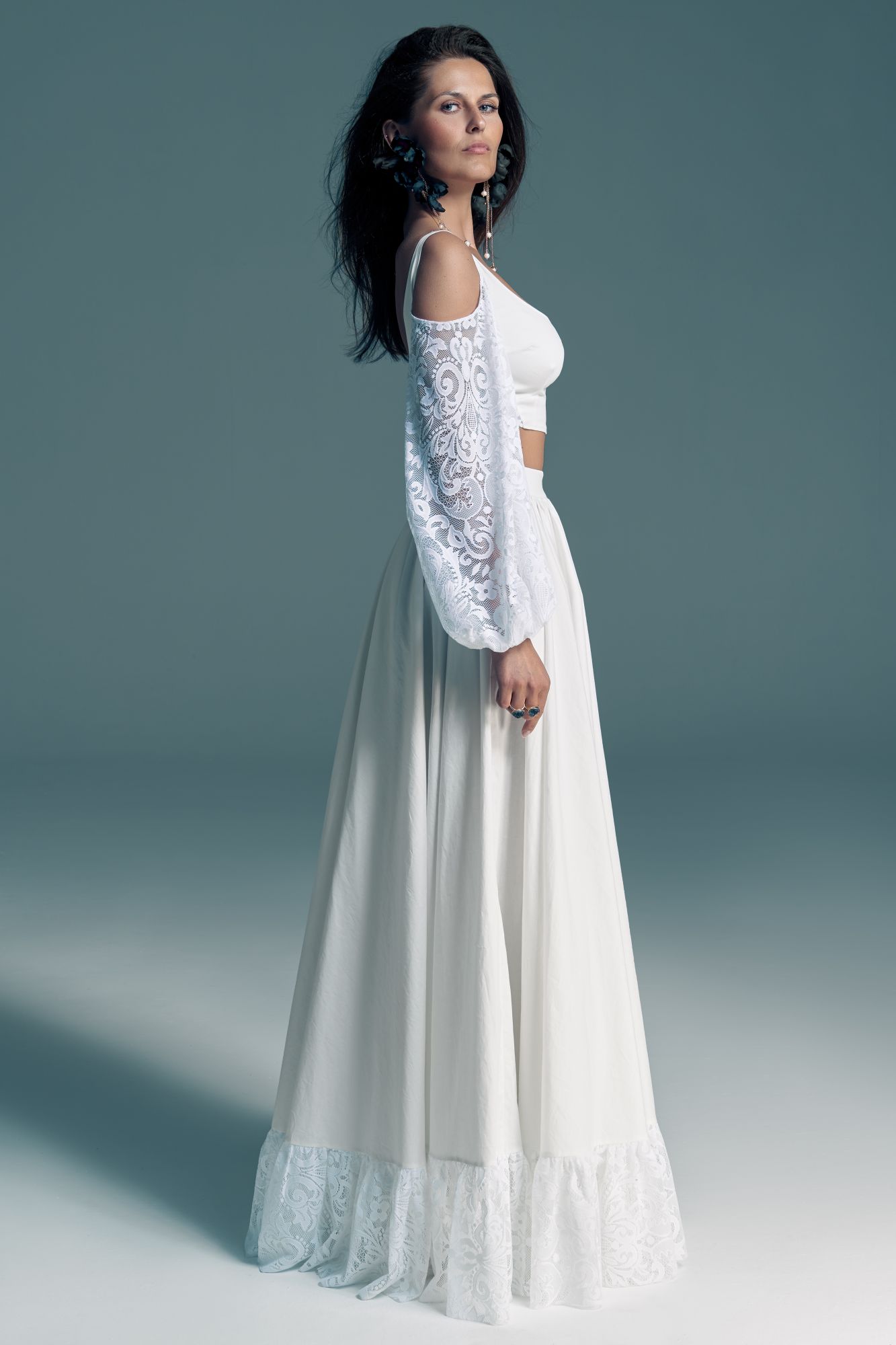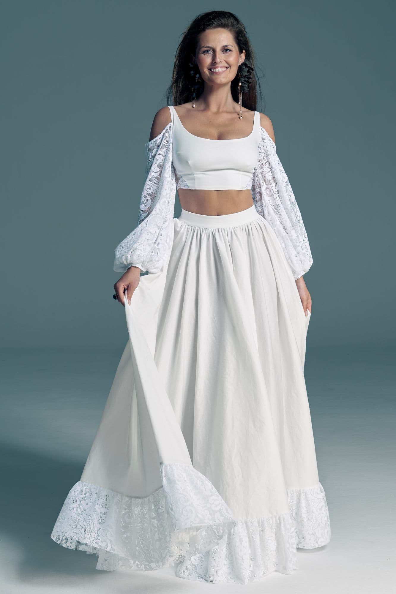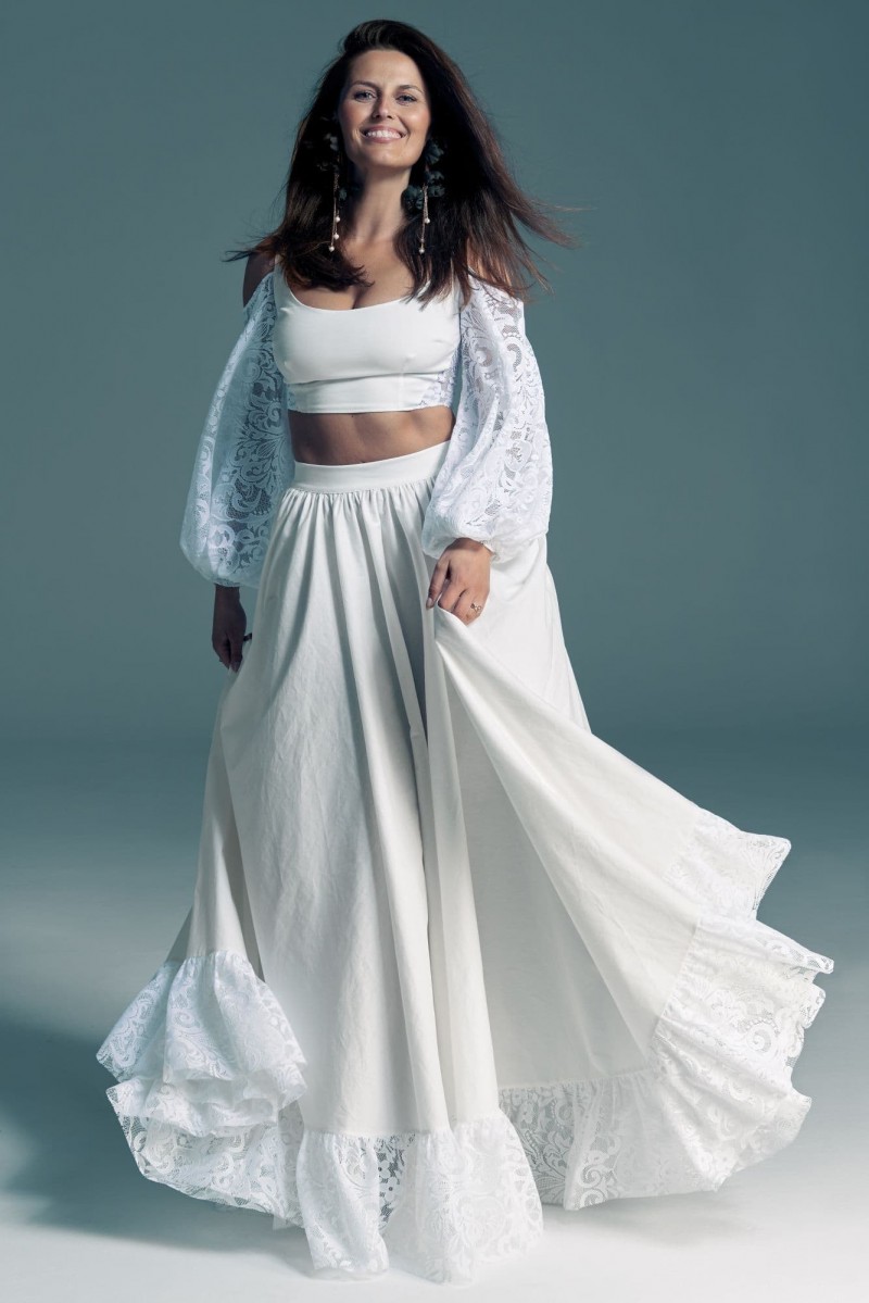 Twoją suknię uszyjemy ze sprawdzonych i przetestowanych przez nas materiałów. W tej sukni dominuje lekka i oddychająca bawełna, jedynie wstawki są z elastycznej koronki. Tkanina ta wprawdzie nie jest tak elastyczna jak nasze koronki i wymaga prasowania, ale jest naturalna i wyjątkowo przyjazna twojej skórze. A jeśli zdecydujesz, by po ślubie przerobić swoją suknię tak, byś mogła ją nosić na co dzień, to z łatwością ją zafarbujesz w profesjonalnej farbiarni.