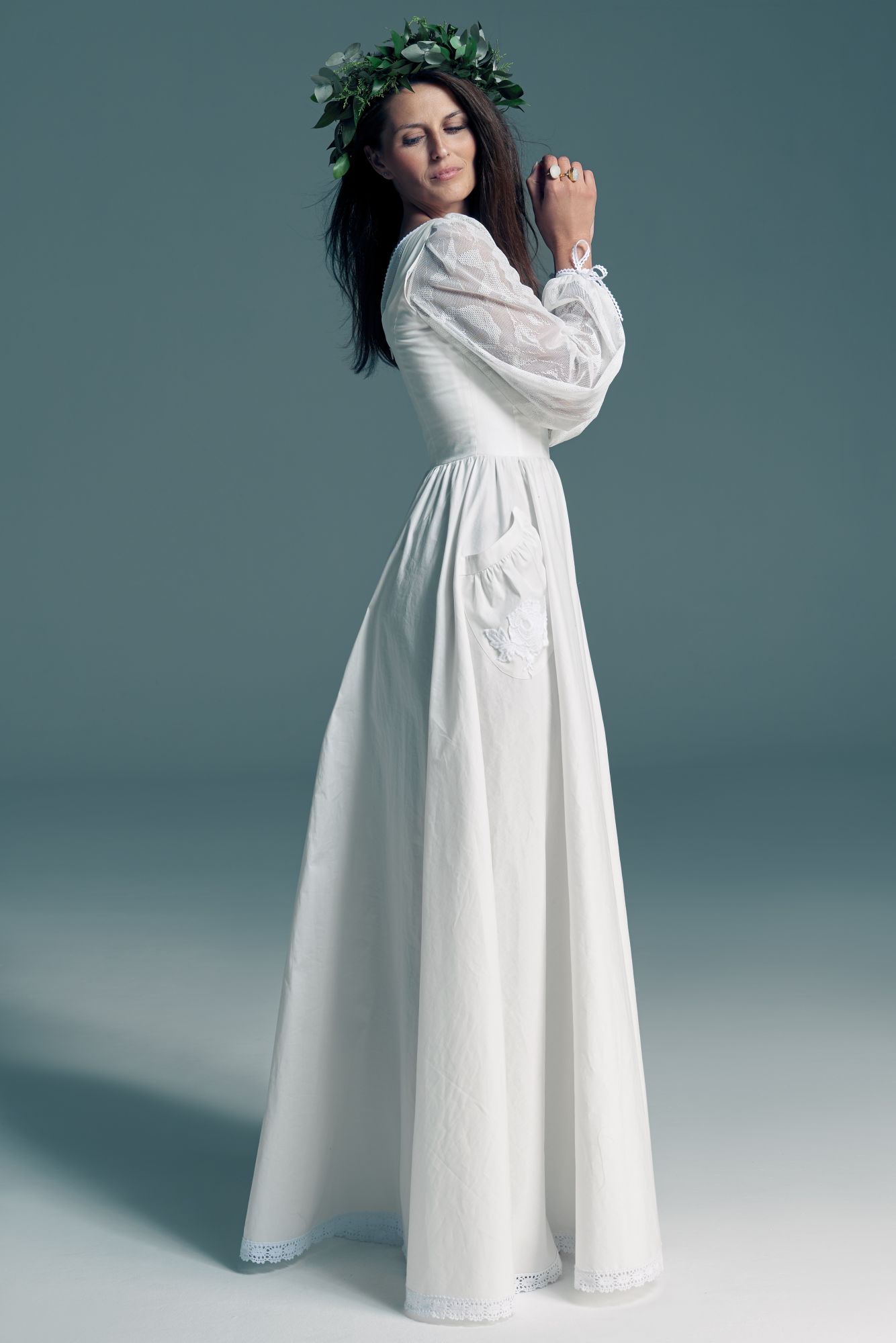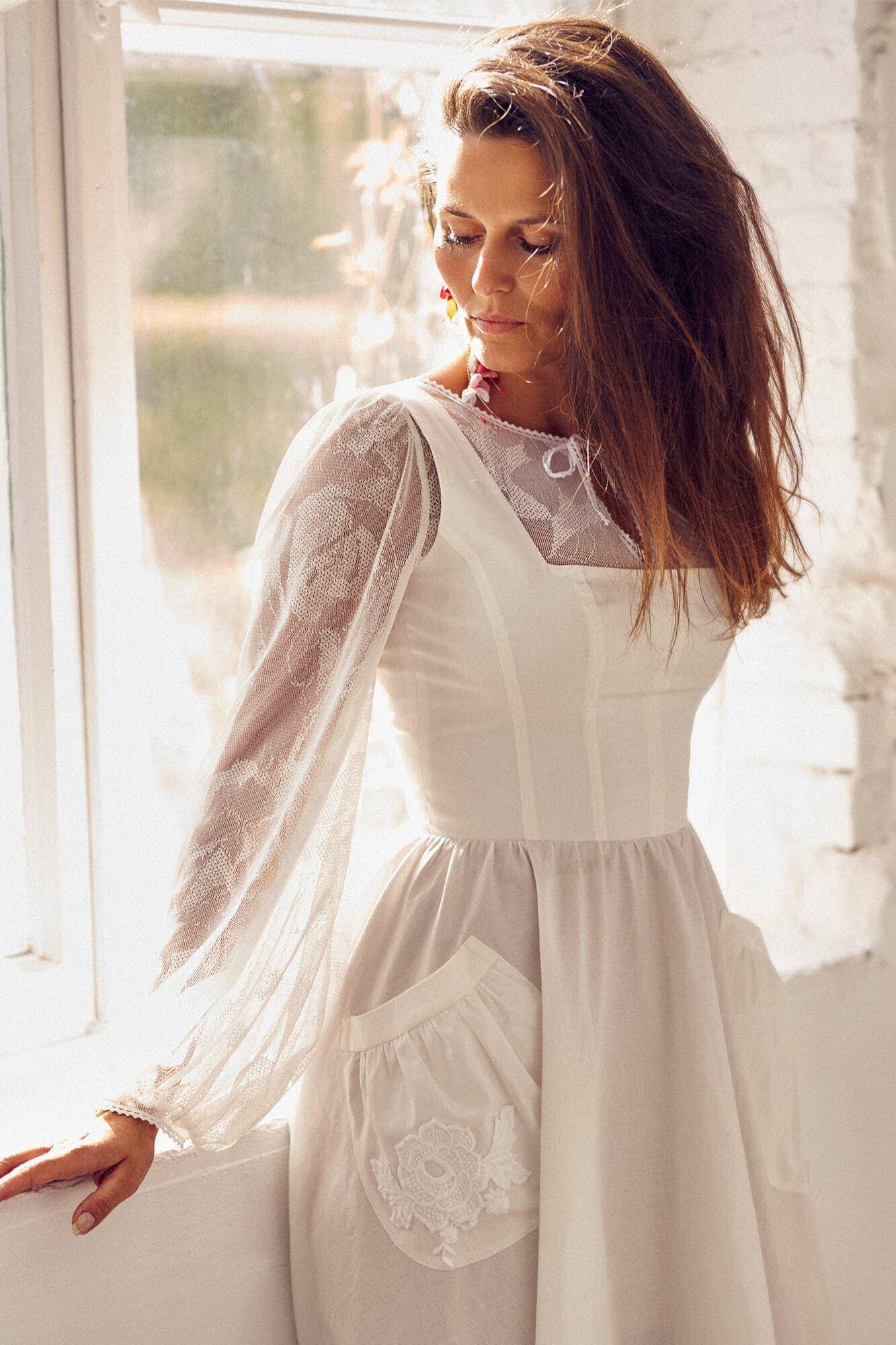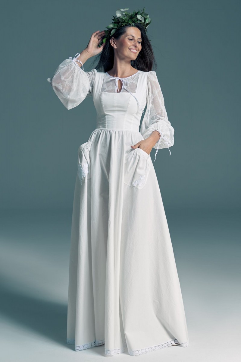 Twoją suknię uszyjemy ze sprawdzonych i przetestowanych przez nas materiałów. W tej sukni dominuje lekka i oddychająca bawełna, jedynie wstawki są z elastycznej koronki. Tkanina ta wprawdzie nie jest tak elastyczna jak nasze koronki i wymaga prasowania, ale jest naturalna i wyjątkowo przyjazna twojej skórze. A jeśli zdecydujesz, by po ślubie przerobić swoją suknię tak, byś mogła ją nosić na co dzień, to z łatwością ją zafarbujesz w profesjonalnej farbiarni.