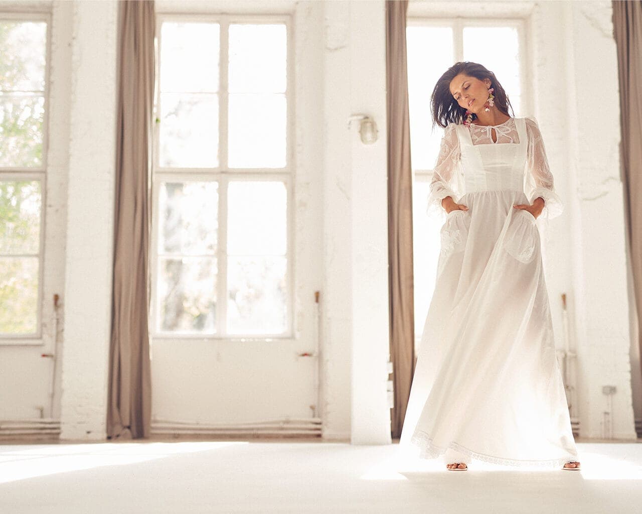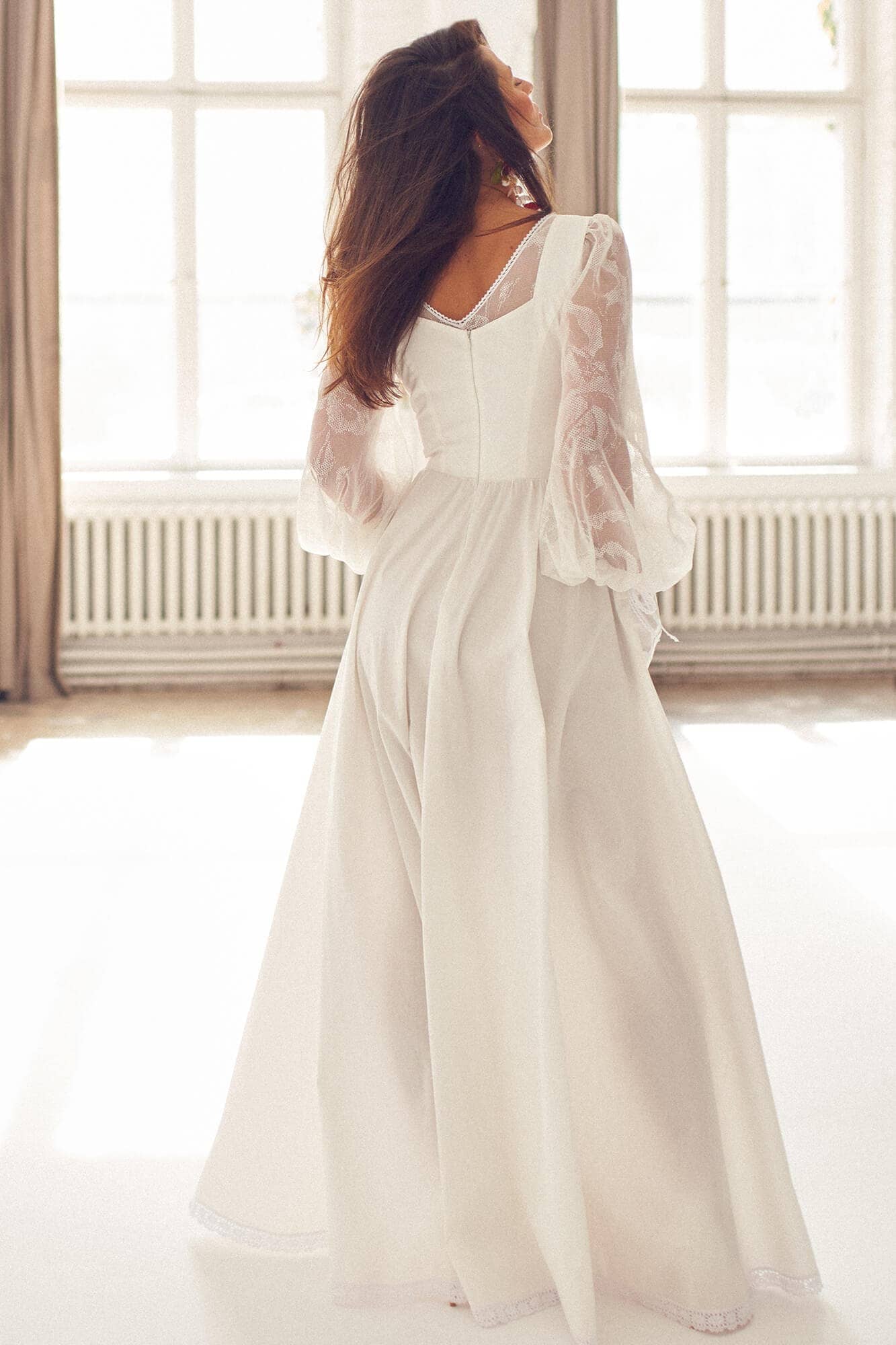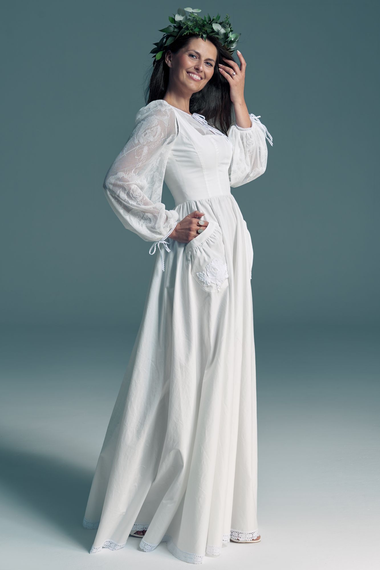 Twoją suknię uszyjemy ze sprawdzonych i przetestowanych przez nas materiałów. W tej sukni dominuje lekka i oddychająca bawełna, jedynie wstawki są z elastycznej koronki. Tkanina ta wprawdzie nie jest tak elastyczna jak nasze koronki i wymaga prasowania, ale jest naturalna i wyjątkowo przyjazna twojej skórze. A jeśli zdecydujesz, by po ślubie przerobić swoją suknię tak, byś mogła ją nosić na co dzień, to z łatwością ją zafarbujesz w profesjonalnej farbiarni.