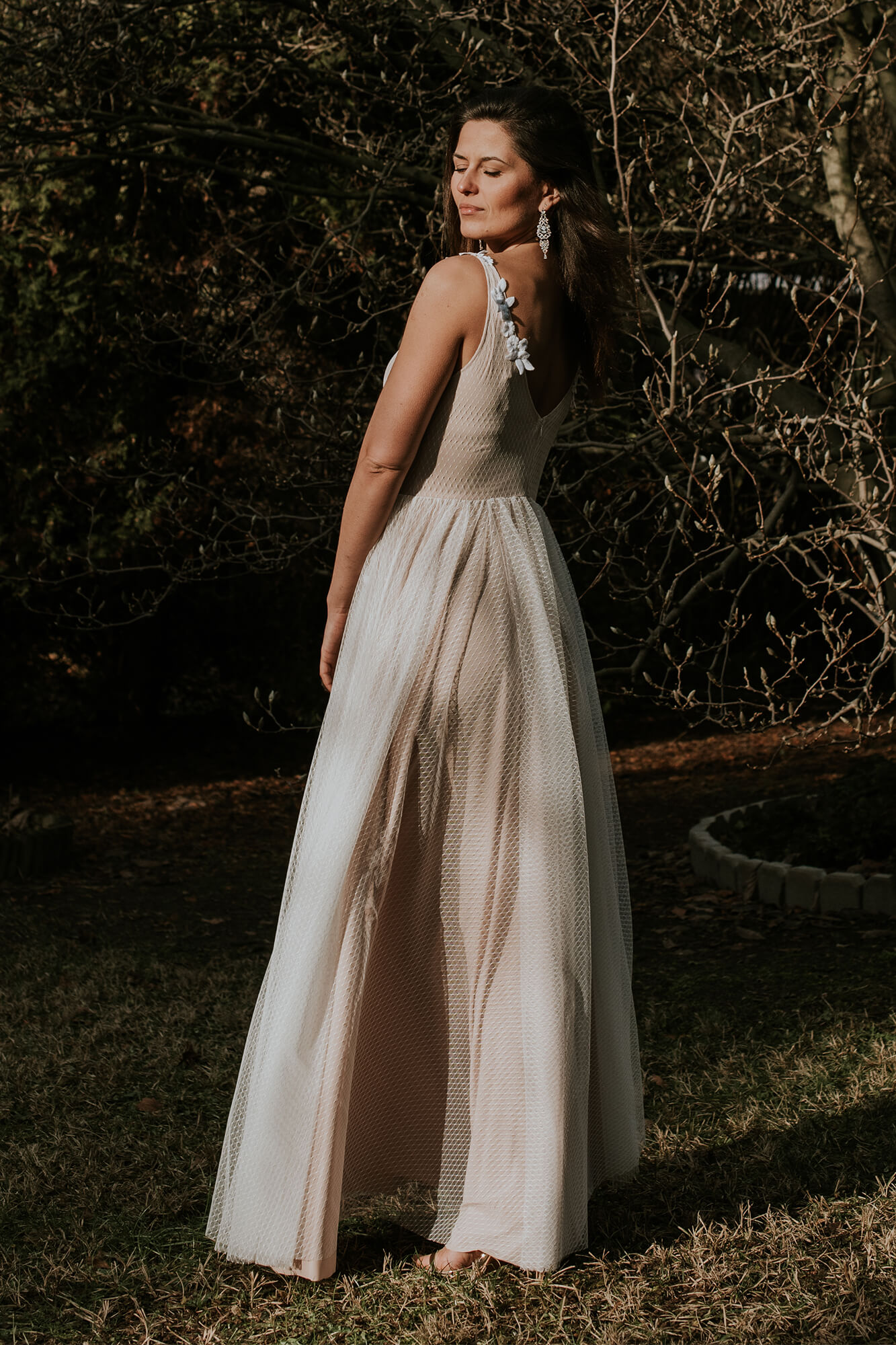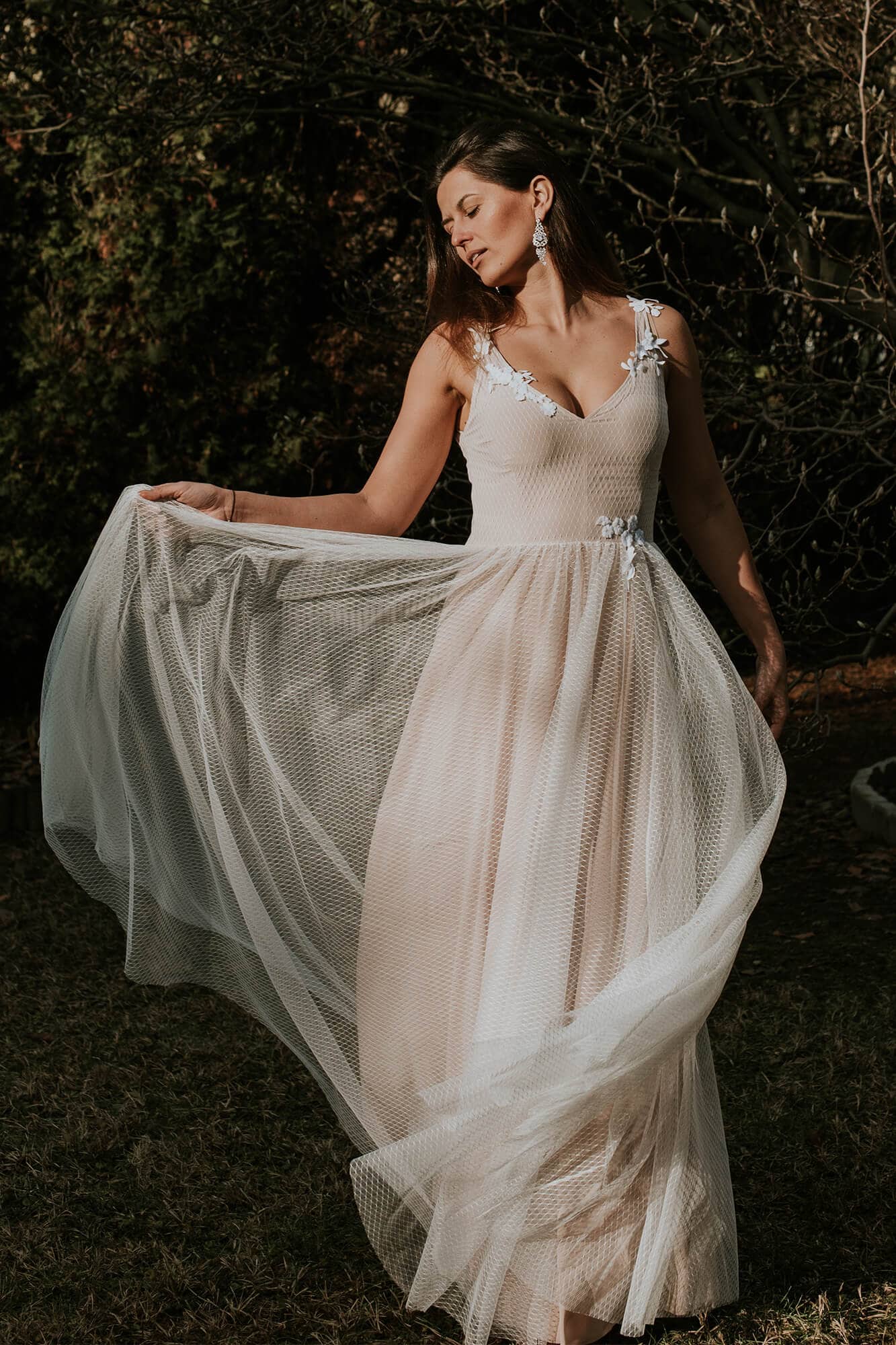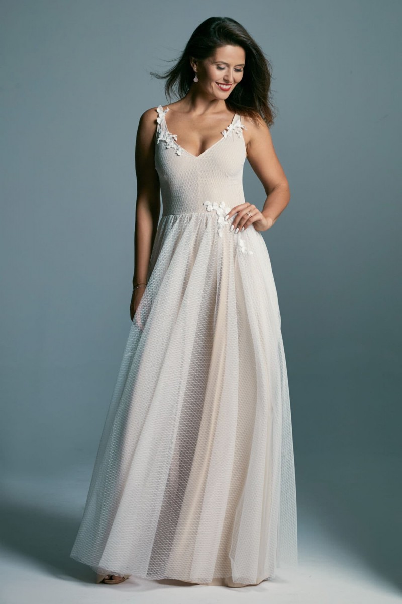 Subtelna, zwiewna, tiulowa suknia ślubna to propozycja dla prawdziwej romantyczki. Wyobraź sobie leśną polanę, siebie z rozwianymi włosami i przepięknie udekorowaną altanę, do której powoli zmierzasz w swojej wyjątkowej kreacji. Ta propozycja z kolekcji Barcelona to niezwykle kobiecy model uszyty z cieniutkiego, niemal przezroczystego tiulu w kolorze écru. Został on ułożony na podszewce w neutralnym kolorze, która doskonale podkreśla jego odcień. Suknia ślubna i tiul to wyjątkowo piękne połączenie, prawda? Chociaż ten materiał kojarzy się z wielowarstwowymi princeskami, to w tym przypadku zupełnie nie musisz martwić się o efekt bezy. Podszewka w piaskowym odcieniu daje wrażenie półnagości i jest przepięknym tłem dla delikatnego geometrycznego wzoru znajdującego się na tiulu. Ta przepiękna suknia ślubna tiulowa posiada również głęboki, niezwykle zmysłowy dekolt z przodu i z tyłu, który przepięknie podkreśla biust, eksponuje plecy oraz wydłuża całą sylwetkę. Pomimo znacznego wycięcia, do tej klasycznej sukni ślubnej z tiulem możesz śmiało założyć stanik. Kształt wycięcia został dopasowany tak, abyś mogła ubrać biustonosz i czuć się swobodnie. Talię oraz ramiączka sukni zdobią drobne aplikacje w postaci delikatnych kwiatuszków wyciętych z bawełnianej koronki. Motywy florystyczne i kwiaty 3D cieszą się ogromnym zainteresowaniem Panien Młodych. Nic dziwnego – dodają całości stylizacji niezwykle dziewczęcego uroku. Ta suknia ślubna tiulowa jest bardzo elastyczna, a dzięki zastosowanym w procesie szycia materiałom idealnie dopasowuje się do większości kobiecych sylwetek. Tiulowa suknia ślubna to romantyczne połączenie, które jednak może kojarzyć Ci się ze sztywnym, niezbyt wygodnym strojem. Wybierając tę suknię nie musisz martwić się o komfort – jest cudownie miękka. A wszystko dzięki temu, że tiul jest delikatny i lekki, a podszewka przylegająca do ciała jest bardzo elastyczna. W swojej kreacji będziesz wyglądała świeżo, zmysłowo i dziewczęco.