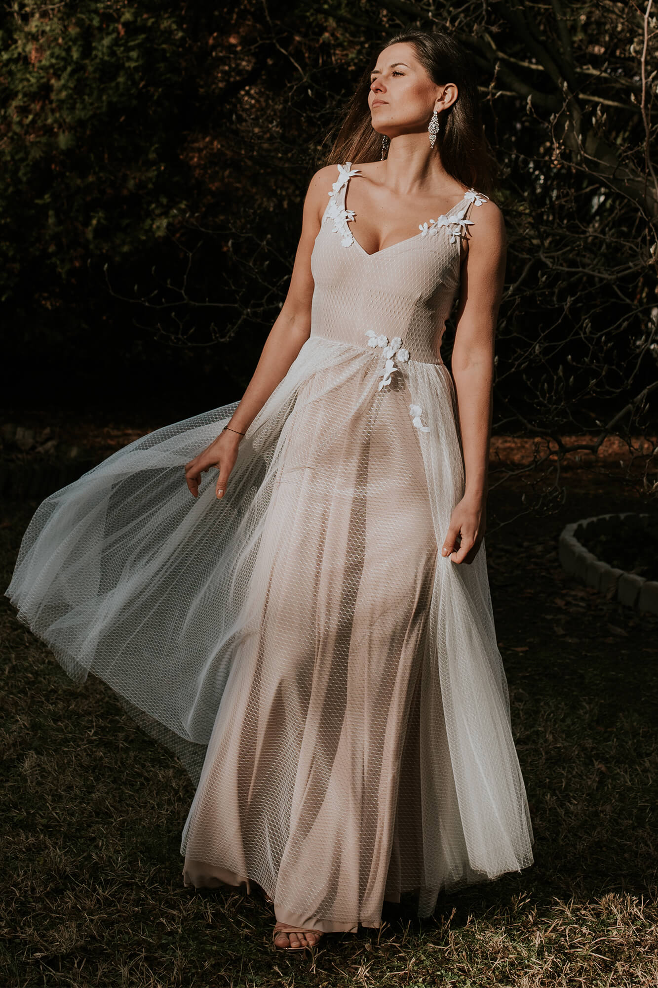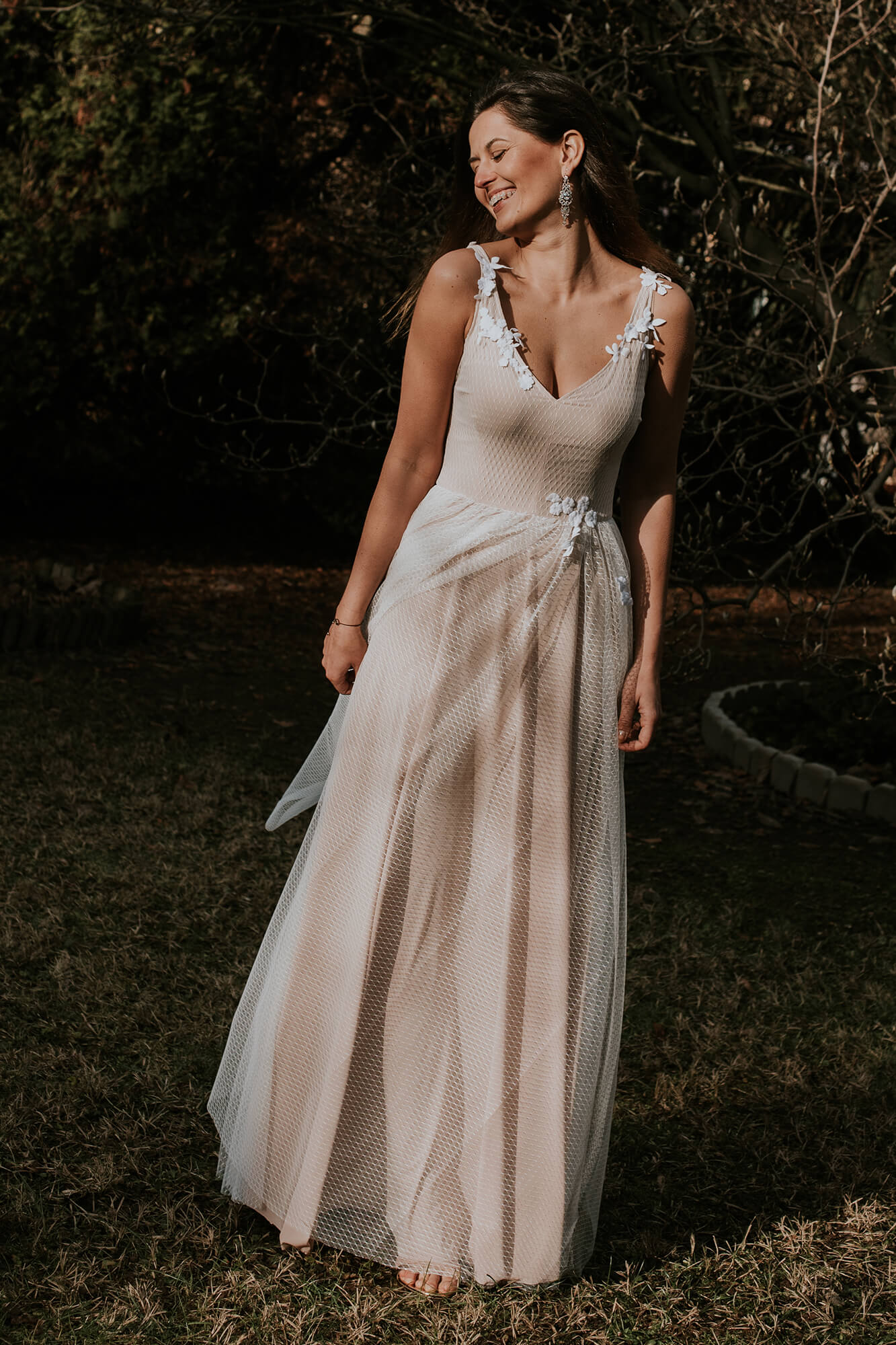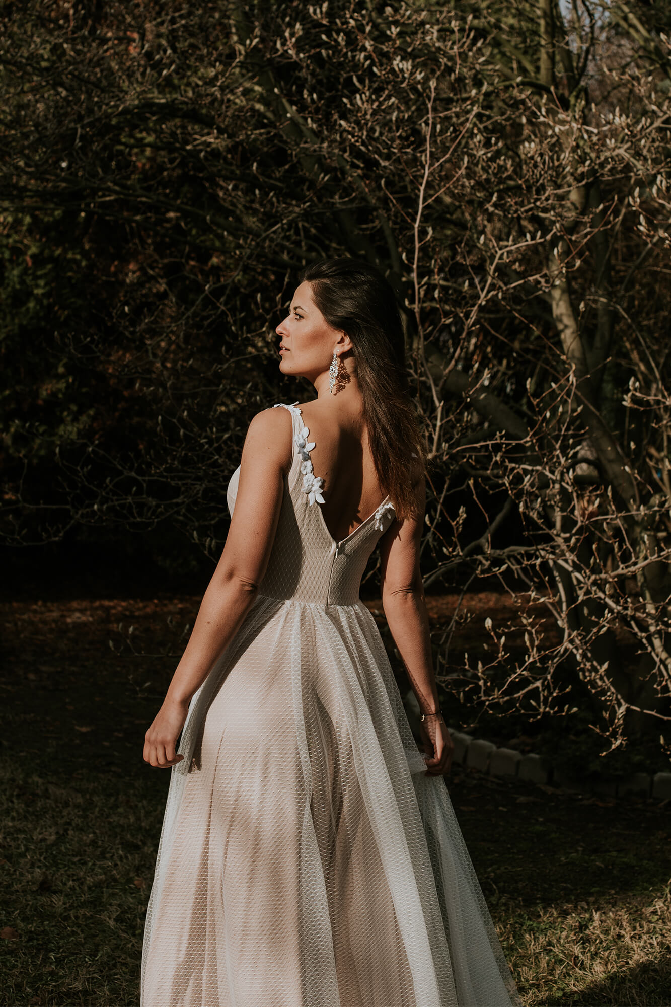 Subtelna, zwiewna, tiulowa suknia ślubna to propozycja dla prawdziwej romantyczki. Wyobraź sobie leśną polanę, siebie z rozwianymi włosami i przepięknie udekorowaną altanę, do której powoli zmierzasz w swojej wyjątkowej kreacji. Ta propozycja z kolekcji Barcelona to niezwykle kobiecy model uszyty z cieniutkiego, niemal przezroczystego tiulu w kolorze écru. Został on ułożony na podszewce w neutralnym kolorze, która doskonale podkreśla jego odcień. Suknia ślubna i tiul to wyjątkowo piękne połączenie, prawda? Chociaż ten materiał kojarzy się z wielowarstwowymi princeskami, to w tym przypadku zupełnie nie musisz martwić się o efekt bezy. Podszewka w piaskowym odcieniu daje wrażenie półnagości i jest przepięknym tłem dla delikatnego geometrycznego wzoru znajdującego się na tiulu. Ta przepiękna suknia ślubna tiulowa posiada również głęboki, niezwykle zmysłowy dekolt z przodu i z tyłu, który przepięknie podkreśla biust, eksponuje plecy oraz wydłuża całą sylwetkę. Pomimo znacznego wycięcia, do tej klasycznej sukni ślubnej z tiulem możesz śmiało założyć stanik. Kształt wycięcia został dopasowany tak, abyś mogła ubrać biustonosz i czuć się swobodnie. Talię oraz ramiączka sukni zdobią drobne aplikacje w postaci delikatnych kwiatuszków wyciętych z bawełnianej koronki. Motywy florystyczne i kwiaty 3D cieszą się ogromnym zainteresowaniem Panien Młodych. Nic dziwnego – dodają całości stylizacji niezwykle dziewczęcego uroku. Ta suknia ślubna tiulowa jest bardzo elastyczna, a dzięki zastosowanym w procesie szycia materiałom idealnie dopasowuje się do większości kobiecych sylwetek. Tiulowa suknia ślubna to romantyczne połączenie, które jednak może kojarzyć Ci się ze sztywnym, niezbyt wygodnym strojem. Wybierając tę suknię nie musisz martwić się o komfort – jest cudownie miękka. A wszystko dzięki temu, że tiul jest delikatny i lekki, a podszewka przylegająca do ciała jest bardzo elastyczna. W swojej kreacji będziesz wyglądała świeżo, zmysłowo i dziewczęco.