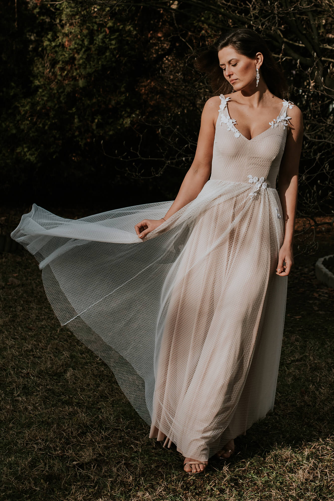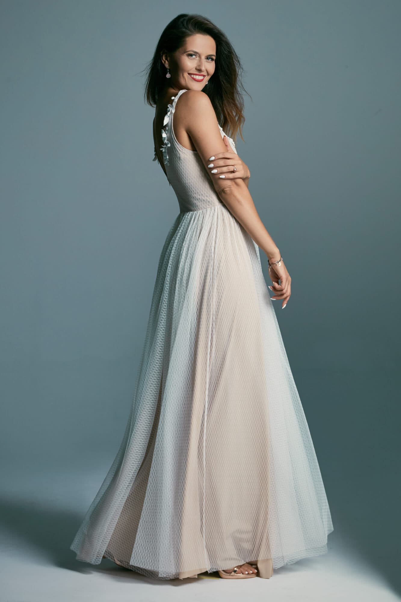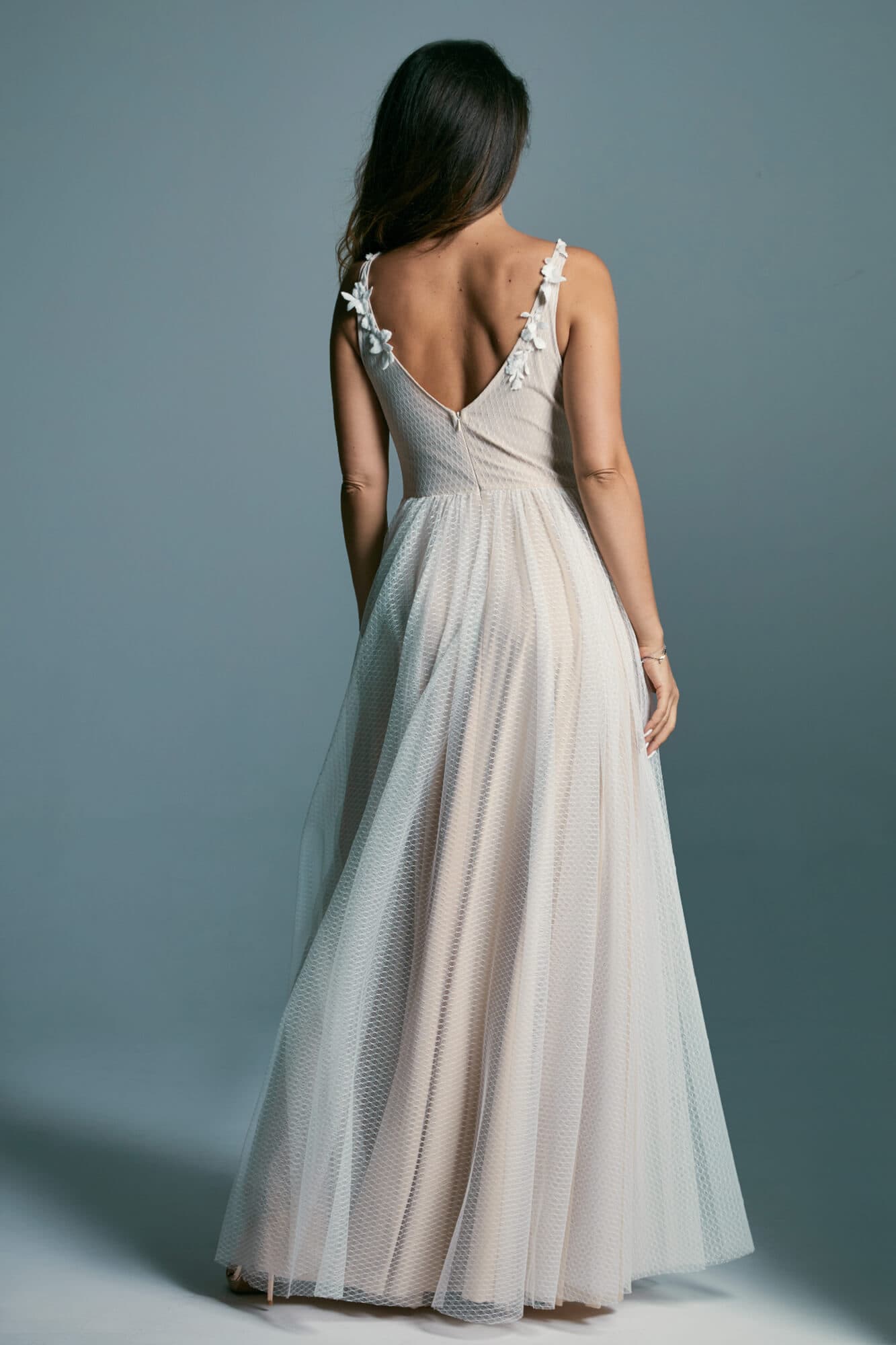 Skromna, tiulowa suknia ślubna na ramiączkach to świetna propozycja dla minimalistek. Nie ma tu mocnych wzorów, zbyt wielu zdobień czy warstw. Szyjąc ten model dla Ciebie, na miarę, możemy to zmienić! Piaskowy kolor podszewki można zastąpić białą lub cielistą. Na ramionach może się pojawić dowolny rękaw, na plecach frędzle, na nogach rozcięcie, a na spódnicy dodatkowe warstwy tiulu. Masz także wpływ na kształt dekoltu czy szerokość ramiączek.