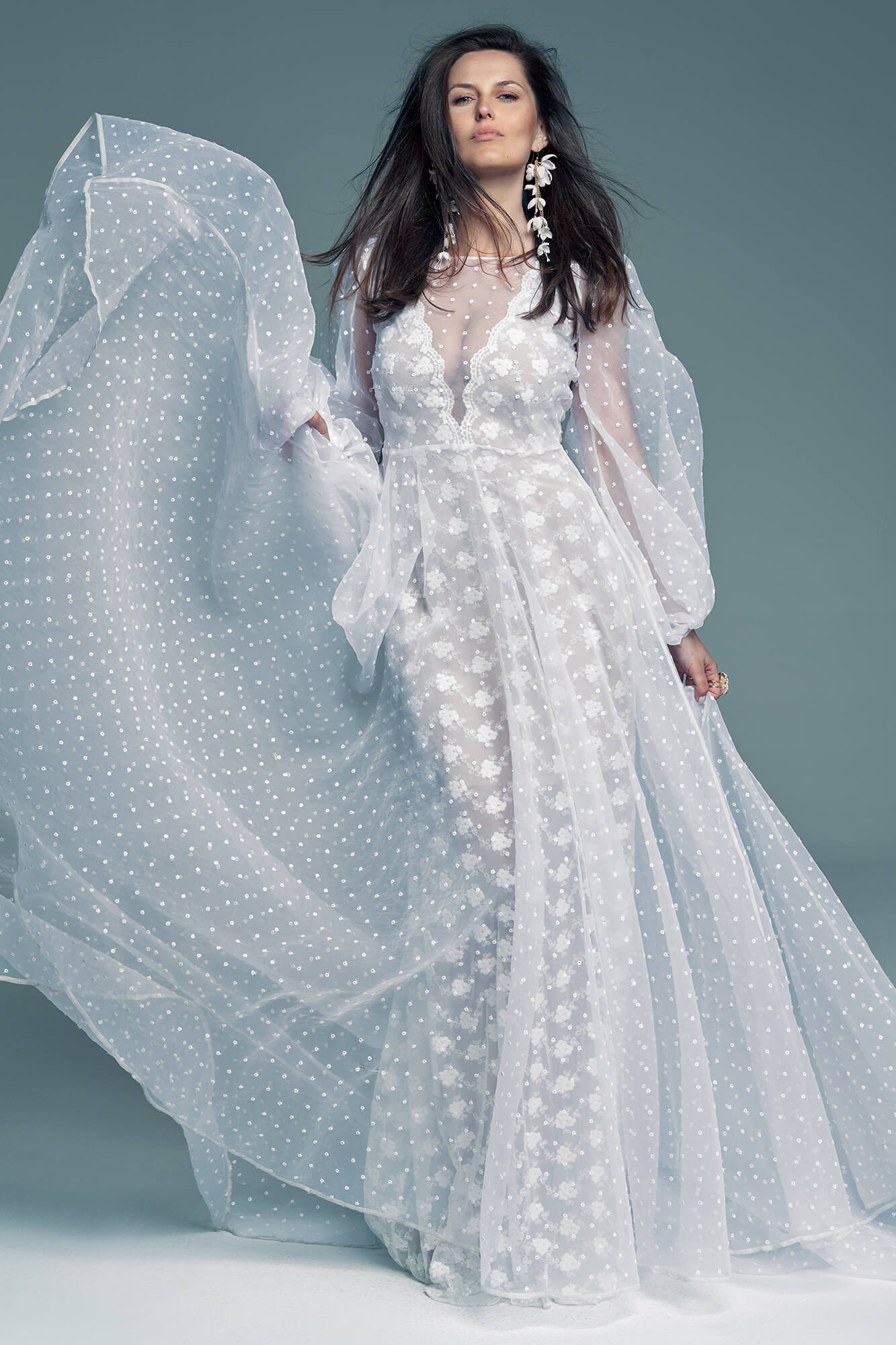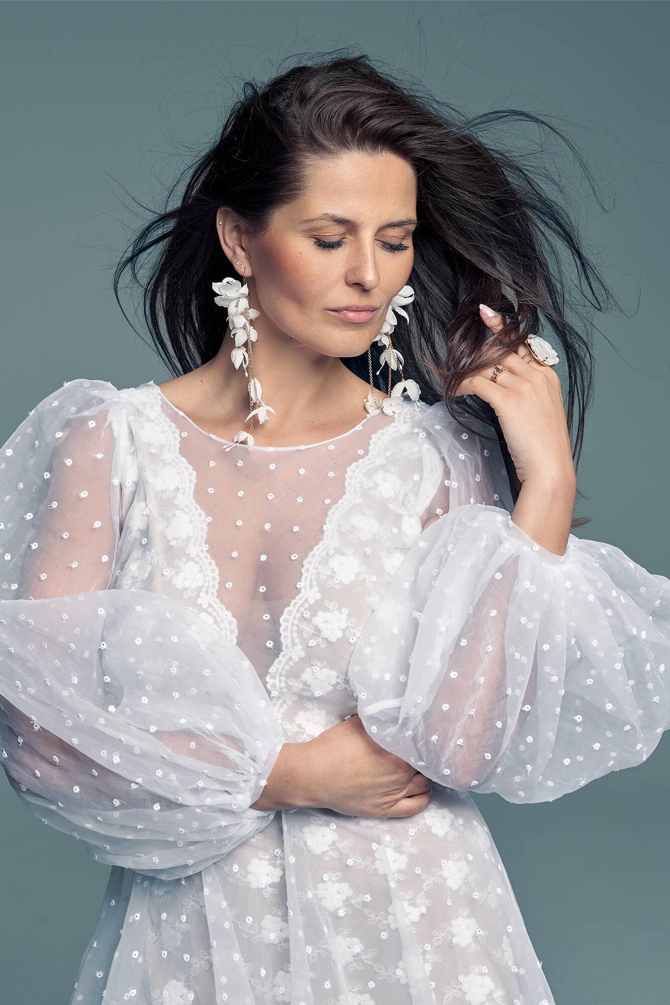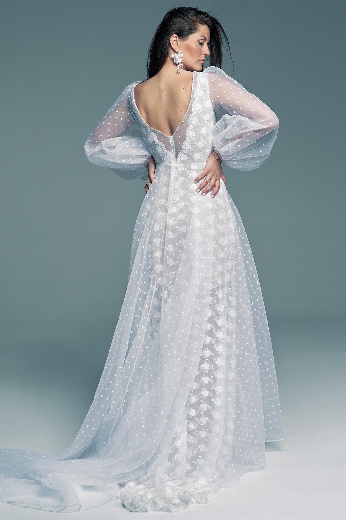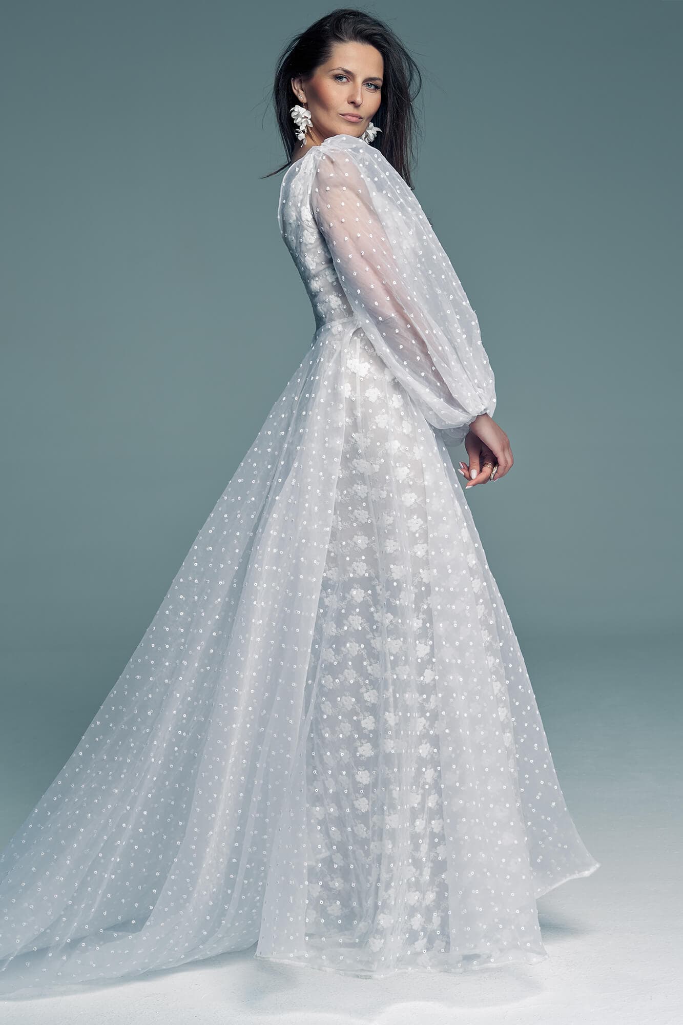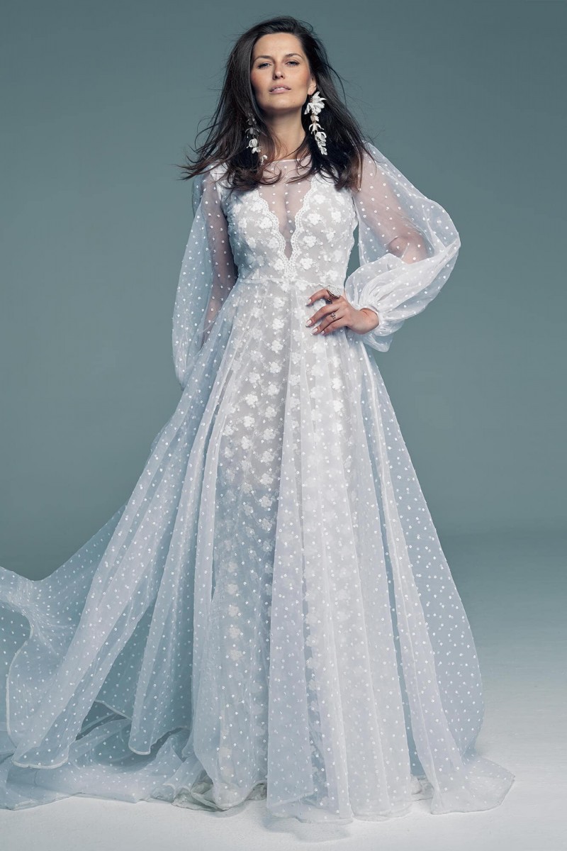 Jeśli nie lubisz nudy, w tym najważniejszym dniu chcesz wyglądać nie tylko wyjątkowo, ale i z charakterem to spójrz na tę oryginalną suknię ślubną. To połączenie nie tylko kolorów, ale też wzorów i faktur. Ta kreacja wygląda z pewnością inaczej niż większość sukien ślubnych w salonach, bo ta propozycja ślubna to właściwie połączenie dwóch sukien. Na pozór dwie zupełnie inne, wydawać by się mogło niepasujące do siebie suknie, tworzą perfekcyjną całość. Pierwsza z nich to połączenie koronki w gęsty, kwiatowy wzór z cielistą podszewką, dzięki której koronkowe kwiatki są jeszcze bardziej widoczne. Druga zaś to organzowa suknia w groszki z bufiastymi rękawami, zabudowanym dekoltem z przodu, głęboko wyciętym z tyłu oraz długim trenem. Duże rękawy, choć półprzezroczyste, mogą jednak sprawiać, że finalnie będziesz wyglądać na masywniejszą, tak więc, jeśli jesteś posiadaczką szerokich ramion, dużego biustu i chcesz dążyć do „zbudowaina” dzięki sukni sylwetki klepsydry to nie będą one zbyt dobrym rozwiązaniem. Sprawdzą się za to świetnie, jeśli masz figurę typu gruszka, ponieważ w sprytny sposób wyrównają proporcje Twojej sylwetki. Ciężko wybrać jeden element tej sukni, który najbardziej przyciąga uwagę, ponieważ jest to mix różnorodności, który finalnie tworzy oryginalny, wyjątkowy i zachwycający look! To świetna propozycja na ślub zarówno kościelny, jak i cywilny. Jeśli szukałaś kreacji, obok której nie da się przejść obojętnie, to ta może być odpowiedzią na Twoje poszukiwania!