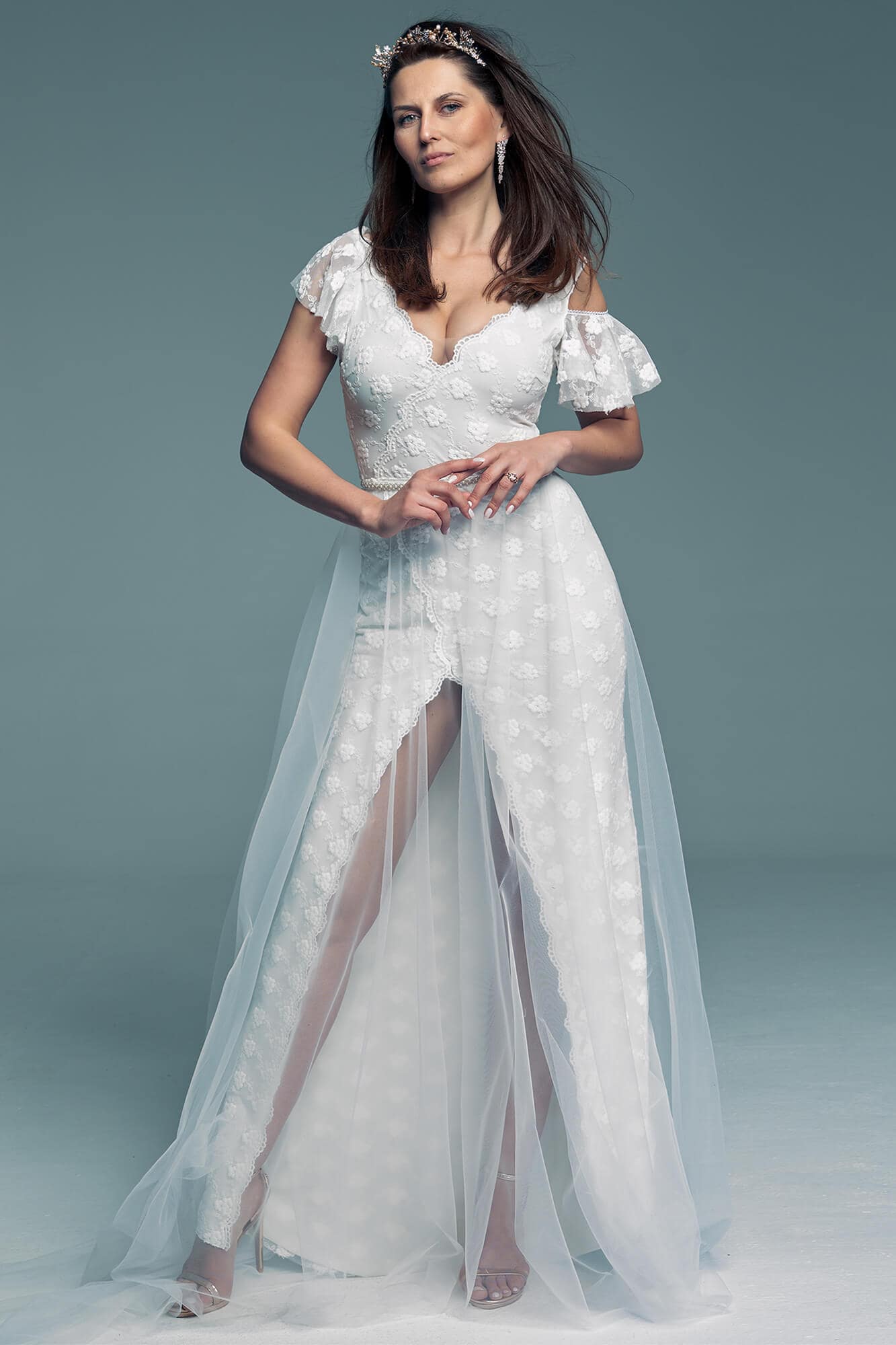 Już wiesz, że nie poszukujesz klasyki i standardowe suknie ślubne nie są dla Ciebie! To świetnie, bo ta ślubna propozycja z pewnością do takich nie należy. Połączenie kwiecistej koronki z tiulem i głębokim rozporkiem to bez wątpienia seksowne połączenie dla nieco odważniejszych Panien Młodych.