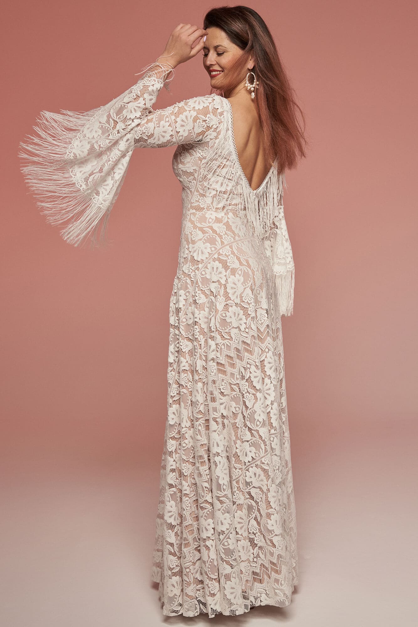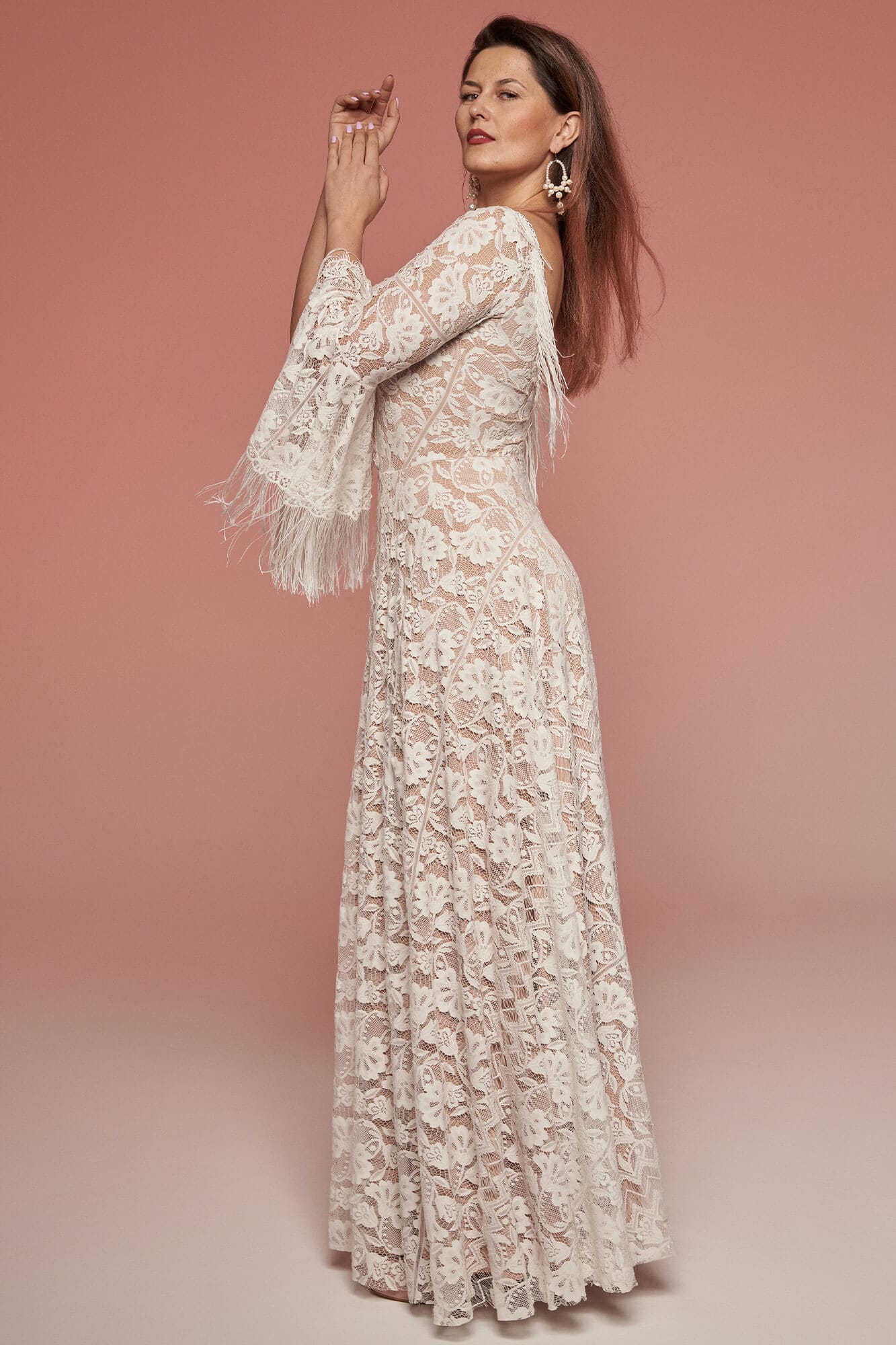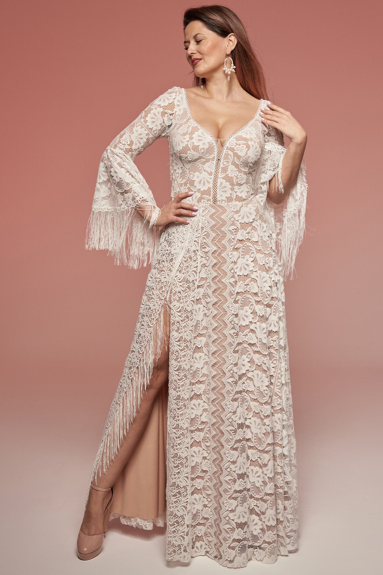Ta suknia to model wyjściowy - możemy w niej zmienić praktycznie wszystko! Pogłębić lub spłycić dekolt, zmienić jego wykończenie, kształt, dodać lub odjąć falbankę czy frędzle. Rękawy mogą być dłuższe lub krótsze, mieć inny kształt niż te na zdjęciu. Może też nie być ich wcale. Tiul w spódnicy można dodać (lub odjąć) na wierzchu, albo pod spodem. Podszewka może być długa lub krótka w odcieniach bieli i beżu. Rozcięcie na nogę i tren można dodać lub usunąć praktycznie w każdym modelu.