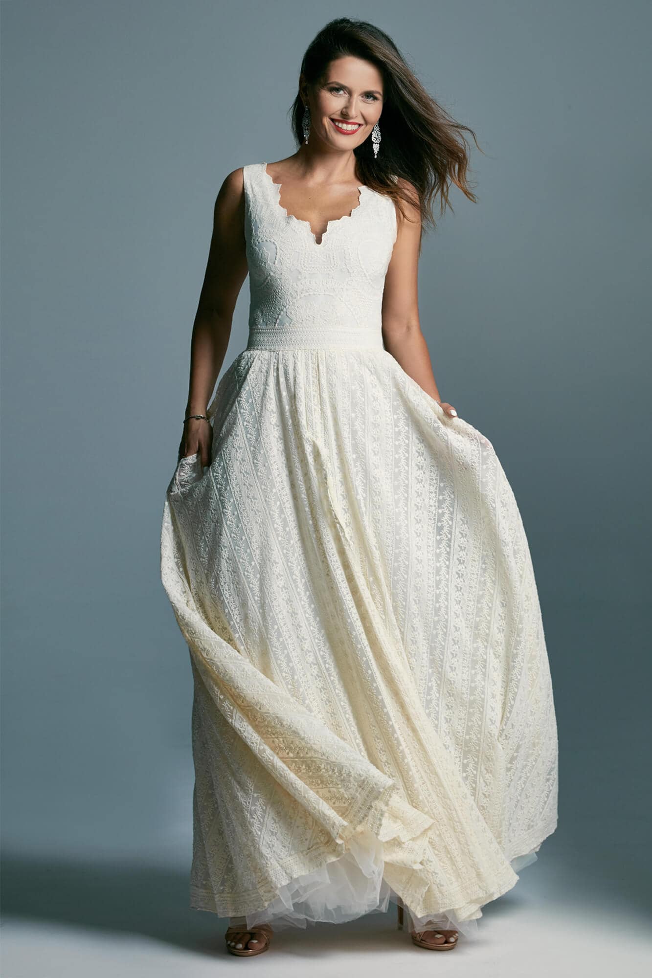 Ta suknia to model wyjściowy - możemy w niej zmienić praktycznie wszystko! Pogłębić lub spłycić dekolt, zmienić jego wykończenie, kształt, dodać lub odjąć falbankę czy frędzle. Rękawy mogą być dłuższe lub krótsze, mieć inny kształt niż te na zdjęciu. Może też nie być ich wcale. Tiul w spódnicy można dodać (lub odjąć) na wierzchu, albo pod spodem. Podszewka może być długa lub krótka w odcieniach bieli i beżu. Rozcięcie na nogę i tren można dodać lub usunąć praktycznie w każdym modelu.