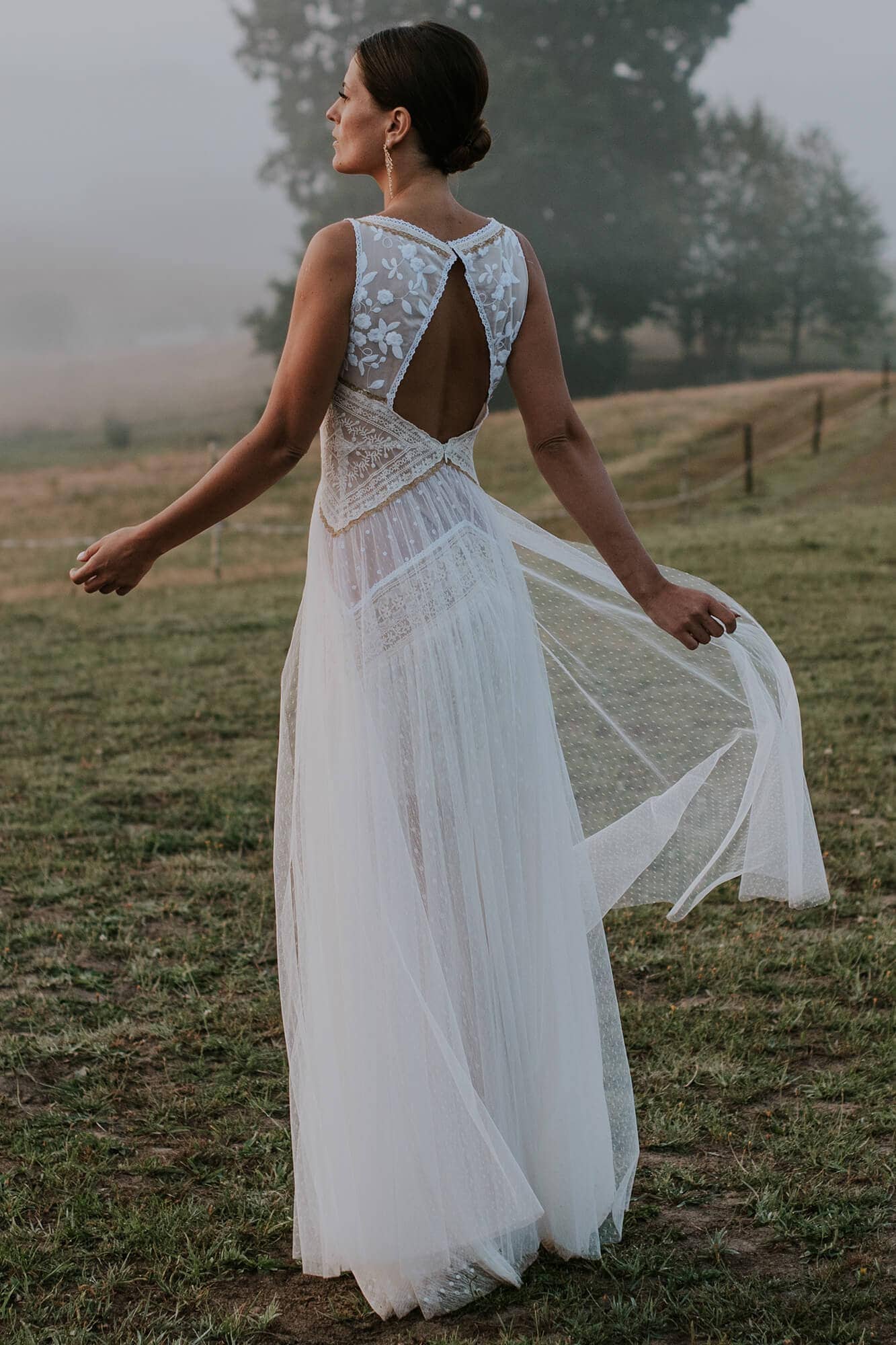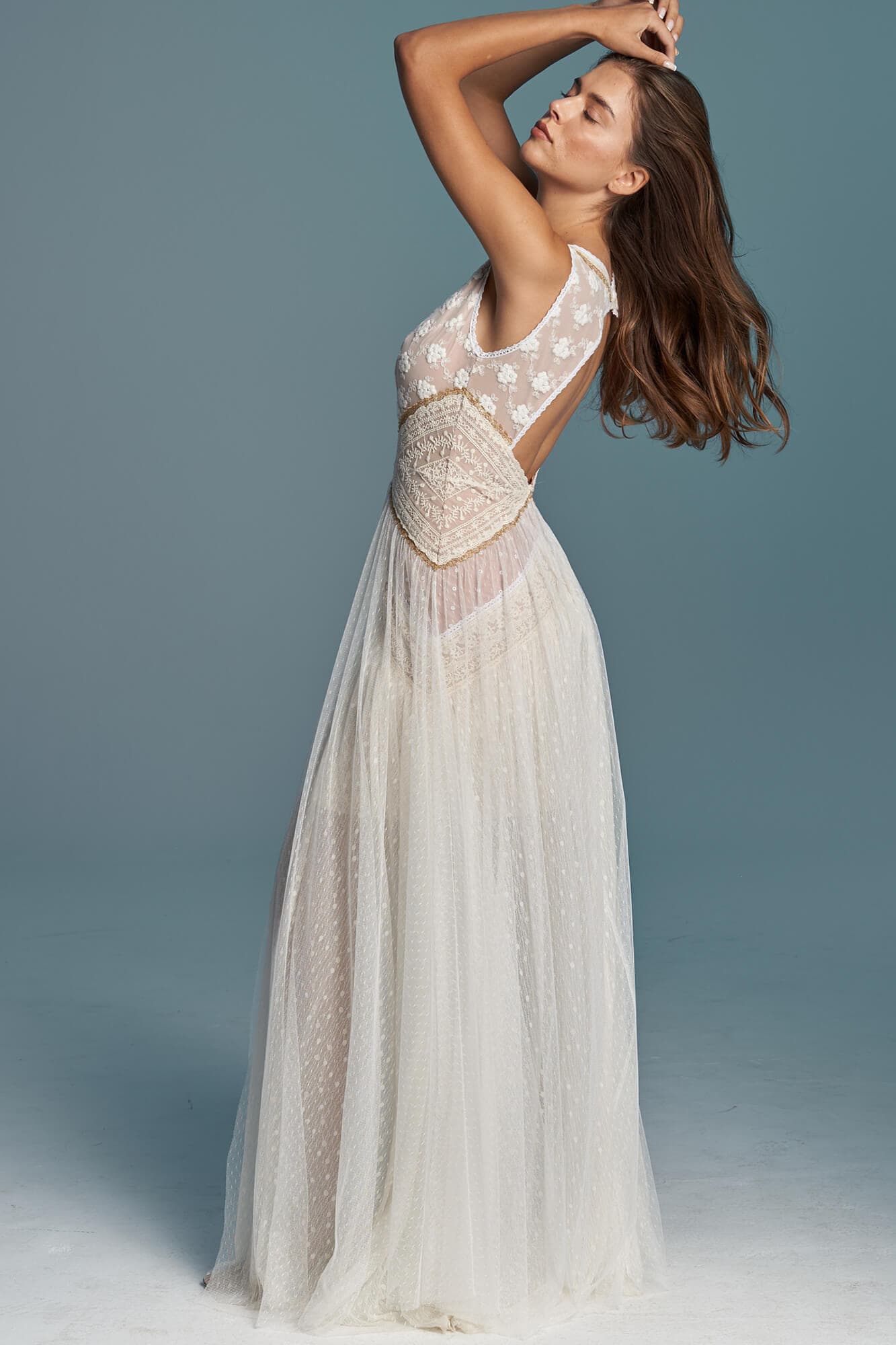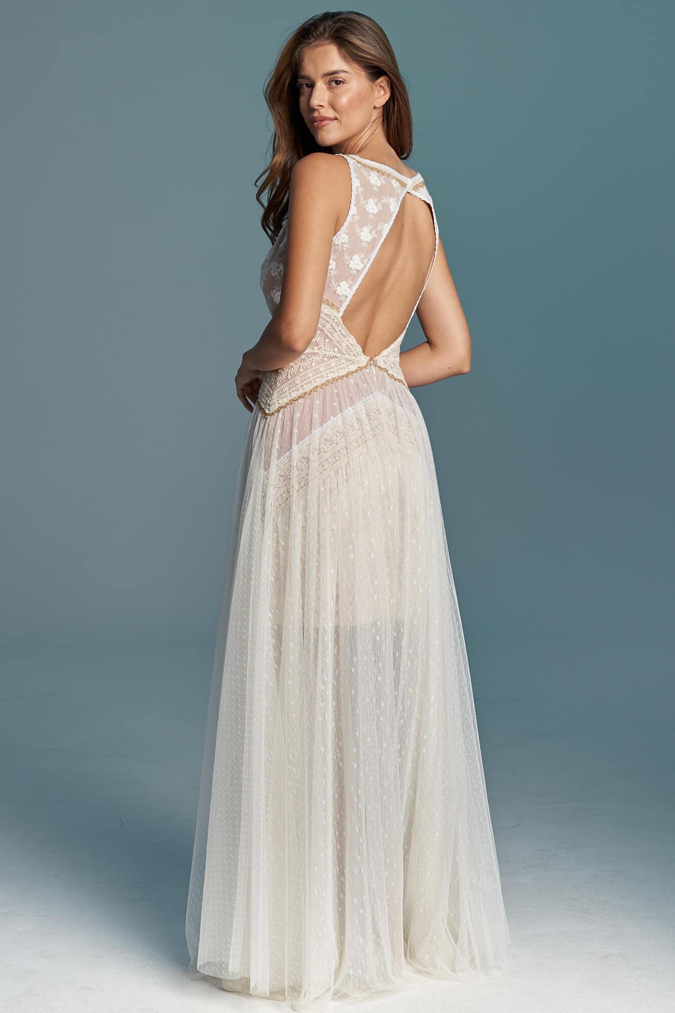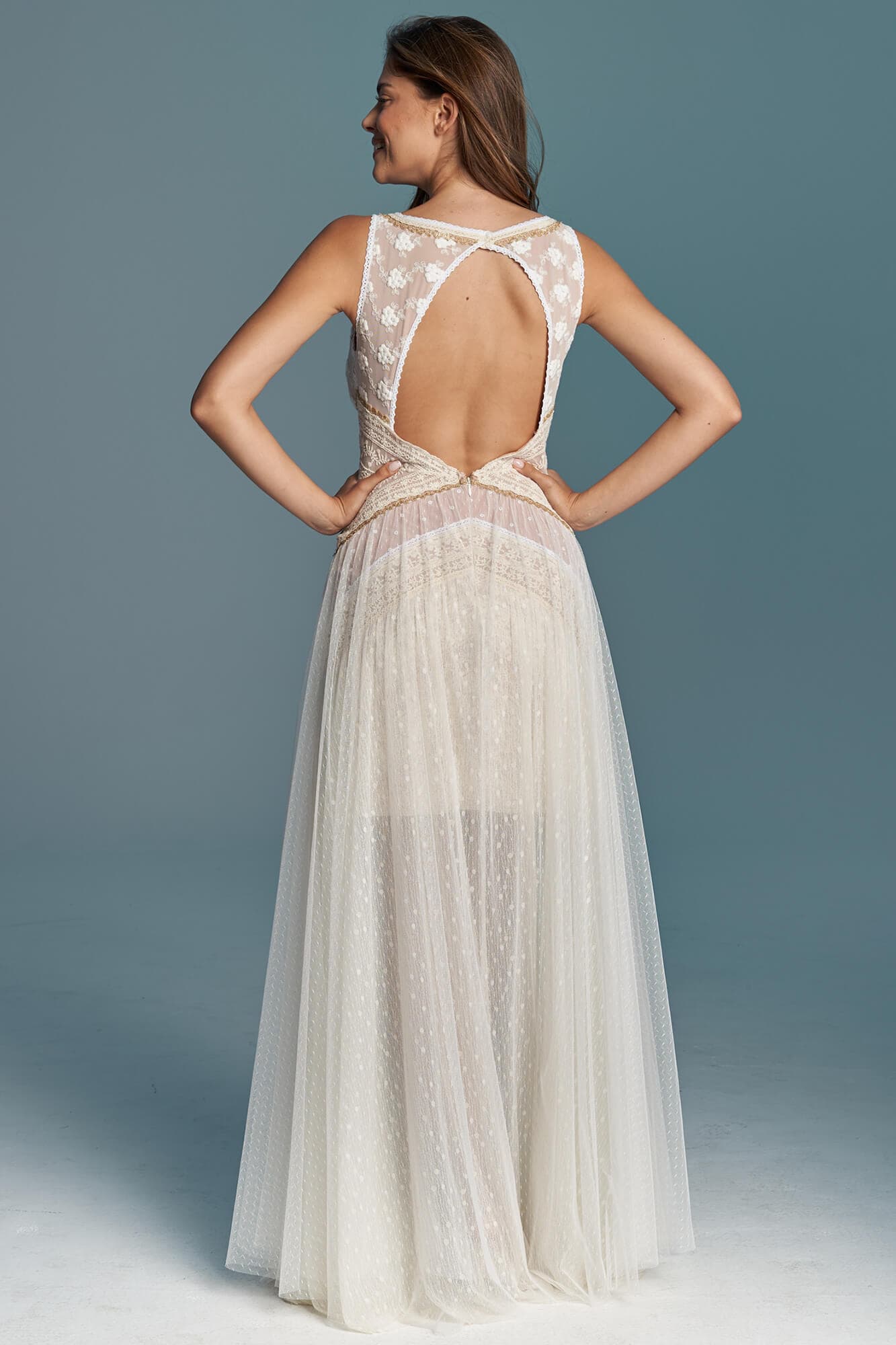 Ta suknia to model wyjściowy - możemy w niej zmienić praktycznie wszystko! Pogłębić lub spłycić dekolt, zmienić jego wykończenie, kształt, dodać lub odjąć falbankę czy frędzle. Rękawy mogą być dłuższe lub krótsze, mieć inny kształt niż te na zdjęciu. Może też nie być ich wcale. Tiul w spódnicy można dodać (lub odjąć) na wierzchu, albo pod spodem. Podszewka może być długa lub krótka w odcieniach bieli i beżu. Rozcięcie na nogę i tren można dodać lub usunąć praktycznie w każdym modelu.