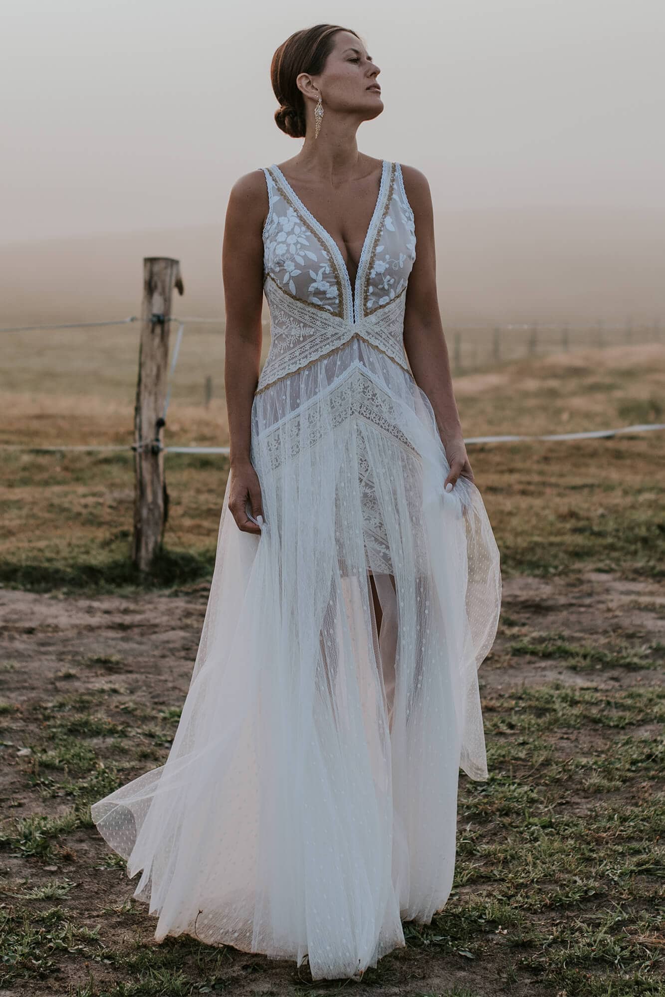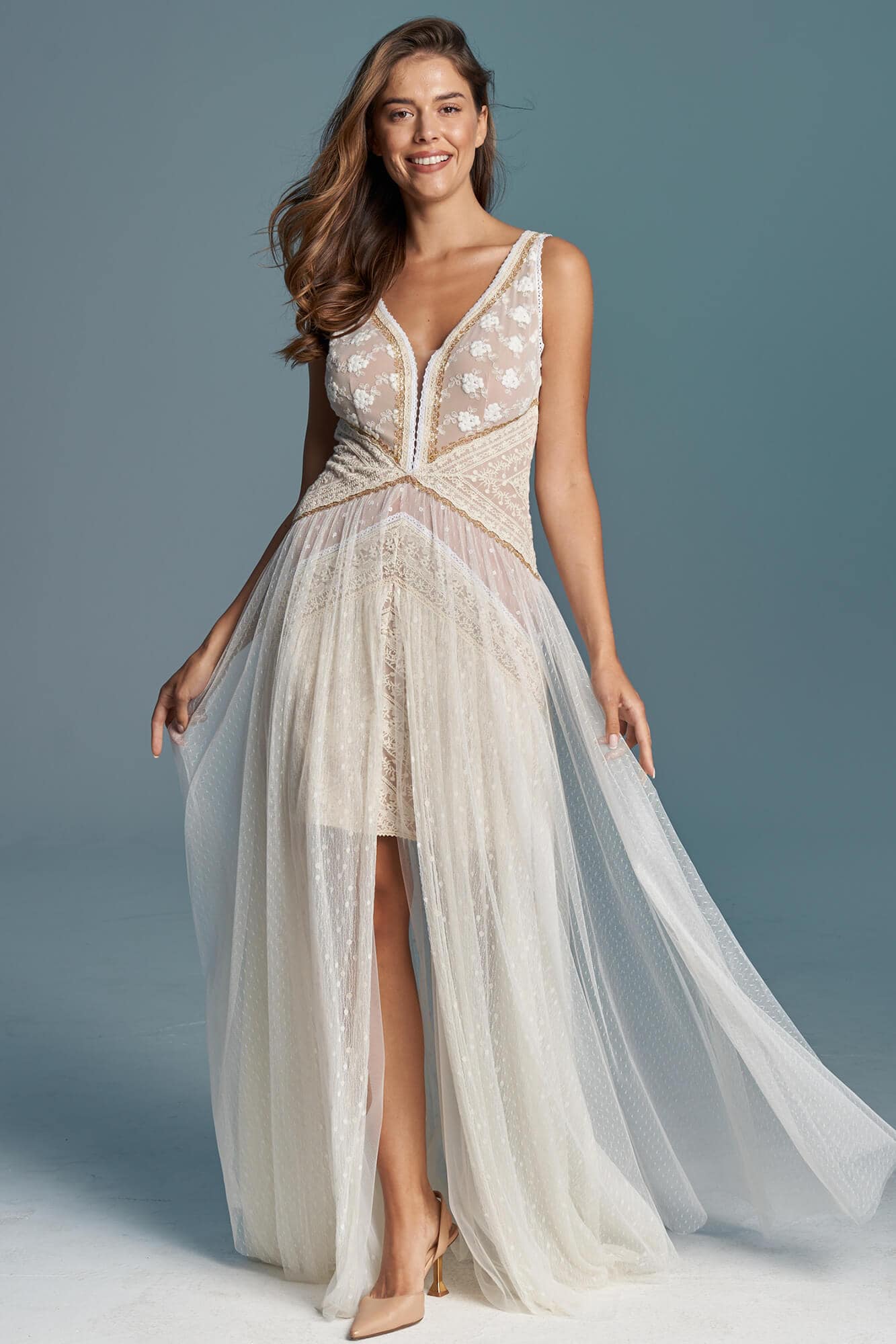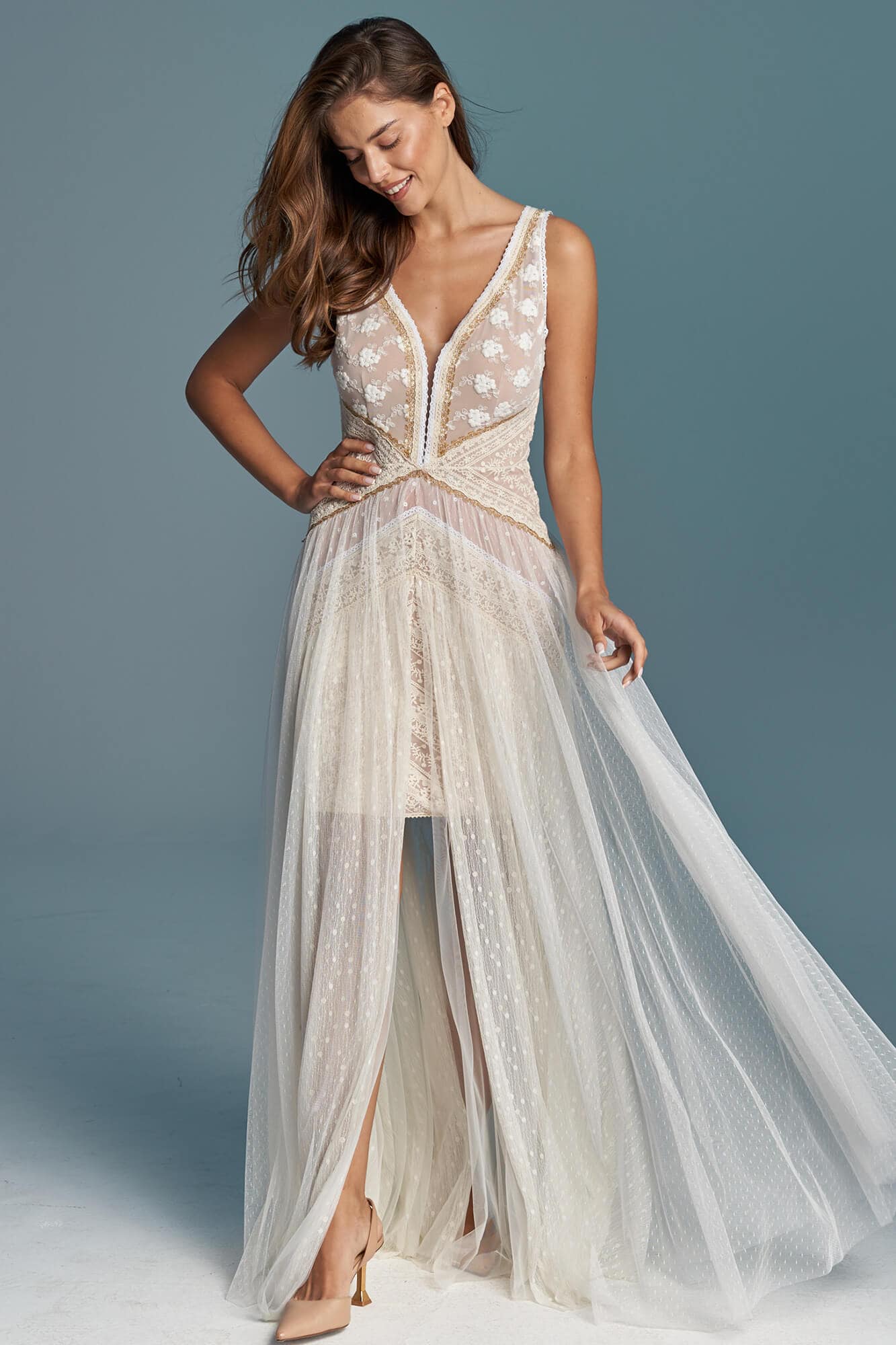 Odkryj modną suknię ślubną, która zachwyca bogactwem koronek w różnych odcieniach bieli, beżu i złota. Głęboki dekolt w literę V i wycięcie na plecach dodają stylizacji sensualności. Trzy warstwy tiulu nadają lekkości i przestrzenności, tworząc zjawiskową, długą kreację. Idealna dla fanek glamour w wydaniu boho. Suknia z kolekcji Barcelona to perfekcyjne połączenie wyrafinowanego stylu i subtelnej ekstrawagancji. Ostatnie metry koronki czekają na Ciebie! Skorzystaj z tej wyjątkowej okazji i zdobądź swoją wymarzoną suknię już dziś! Nie zwlekaj – spraw sobie niepowtarzalną kreację, która będzie emanować Twoim wyjątkowym stylem podczas najważniejszego dnia w Twoim życiu.