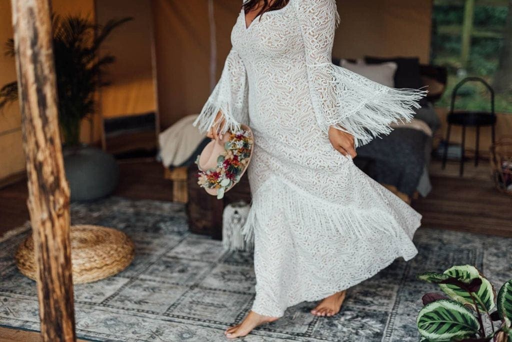 Poprzednia suknia to bez wątpienia przedstawicielka romantycznego klimatu, ale obie są niezwykle kobiece i subtelne. W tej propozycji mamy już więcej stylu boho – frędzle i duże, szerokie rękawy.